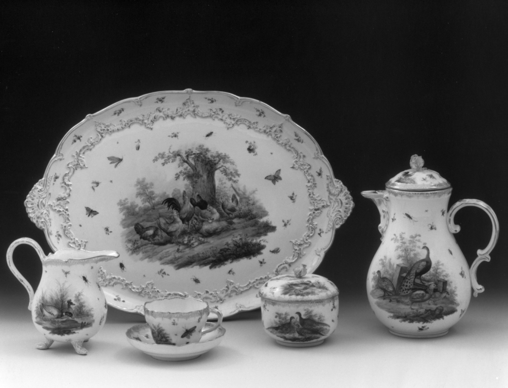 - NOTIZIE STORICO CRITICHE il servizio fu realizzato la direzione di Johann Joachim Kaendler, attivo a Meissen tra il 1731 e il 1775. Le marche presenti sotto i pezzi portano segni di cancellature, che indicano che la decorazione fu eseguita da un artista esterno alla fabbrica, su esemplari probabilmente usciti imperfetti dai forni. La decorazione è databile intorno al 1760. Il vassoio, per foggia, sembra non appartenere alla serie degli altri elementi, cui lo accomuna, invece, il decoro centrale