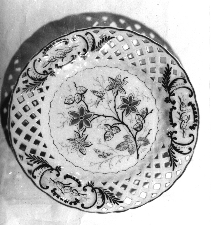 piatto piano con tesa interamente traforata, decorata da targhe con piume e volute; sul fondo, tralci con fiori e foglie; farfalle sul fondo