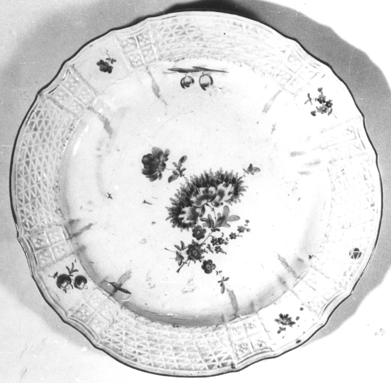 Piatto piano circolare con orlo sagomato profilato in rosso scuro. La tesa è decorata a rilievo con un motivo a paniere con quattro riserve lisce con fiori policromi. Sul fondo bianco sono raffigurati mazzi di fiori policromi con grande fiore viola e petali gialli e rossi e non ti scordar di me