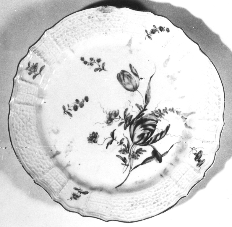Piatto piano circolare con orlo sagomato profilato in rosso scuro. La tesa è decorata a rilievo con un motivo a paniere con quattro riserve lisce con fiori policromi. Sul fondo bianco sono raffigurati mazzi di fiori policromi con tulipani viola e gialli
