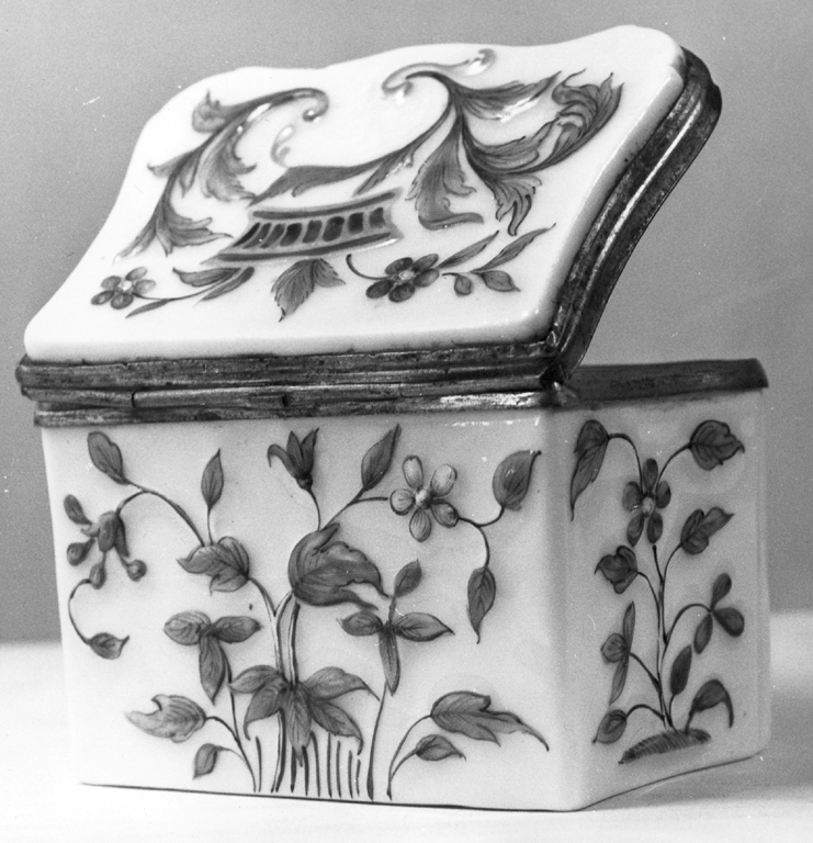 tabacchiera a forma di comò con legatura in metallo dorato; decorato sulla parte anteriore con sei finti cassetti; su tutti gli altri lati, compreso l'interno del coperchio, vi sono motivi decorativi floreali