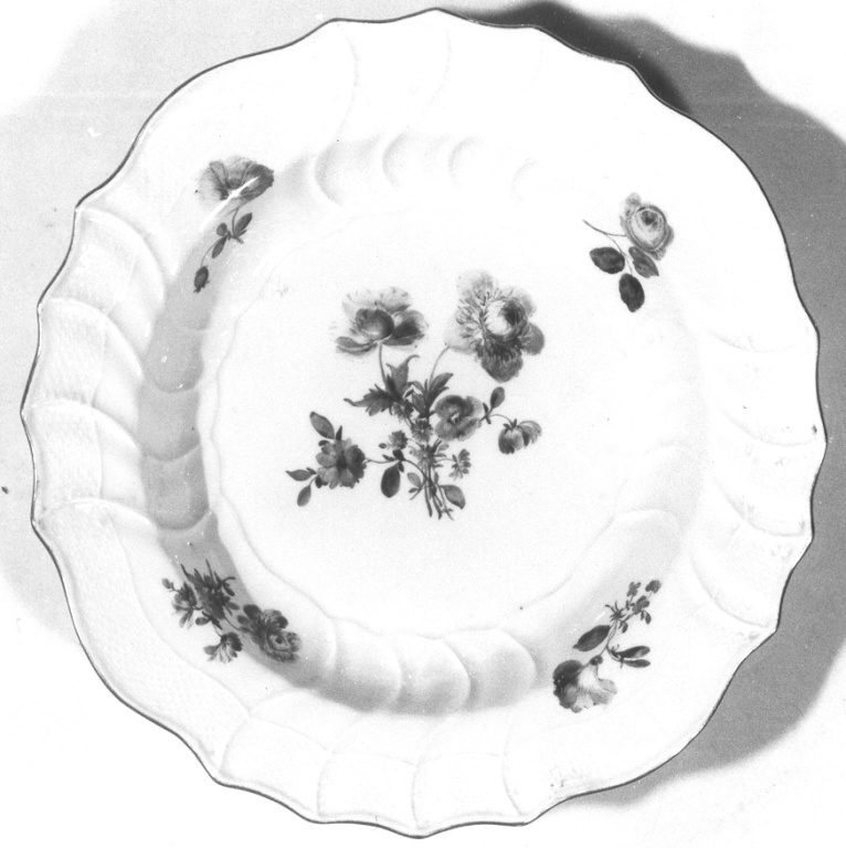 Piatto fondo circolare con bordo sagomato e filettato d'oro. La tesa presenta una fascia a rilievo simulante un fitto intreccio ed è percorsa da nervature ondulate che convergono verso il centro. Sul fondo bianco sono dipinti fiori e mazzi di fiori policromi con fiori viola, gialli, azzurri e arancio