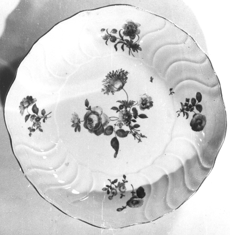 Grande piatto circolare con alto bordo filettato d'oro. La tesa presenta una fascia a rilievo che simula un intreccio ed è percorsa da nervature ondulate che convergono verso il centro. Sul fondo bianco sono dipinti fiori e mazzi di fiori policromi con rosa, crisantemo e fiori gialli e arancioni