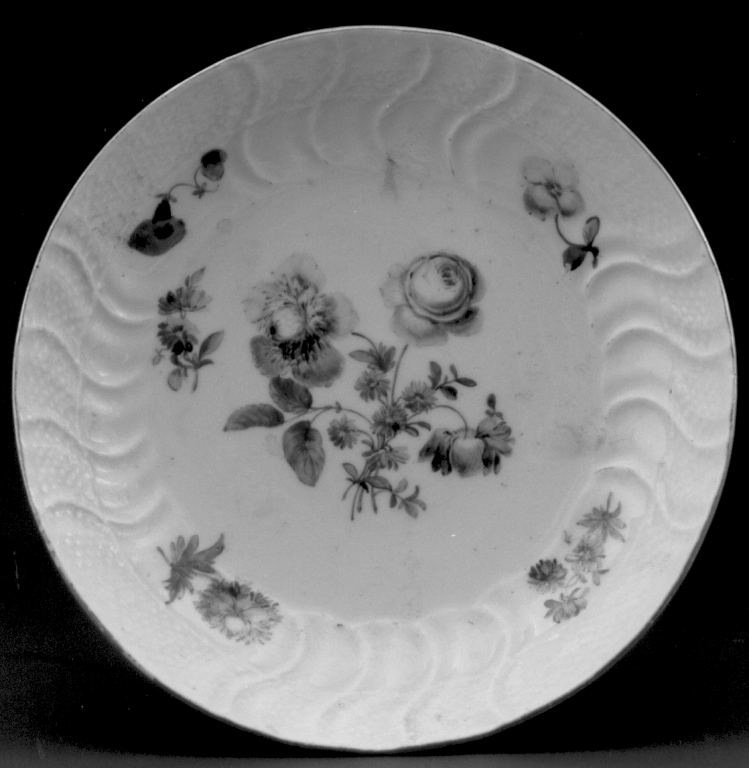 Piattino di tazza circolare con orlo filettato d'oro. La tesa presenta una fascia a rilievo a intreccio di vimini ed è percorsa da nervature ondulate che convergono vero il centro. Su fondo bianco sono dipinti fiori policromi tra cui una rosa e fiori arancioni, viola e gialli