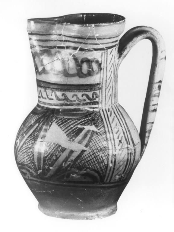a corpo globulare su basso piede leggermente cercinato, alto collo con orlo trilobato, ansa a nastro con nervatura centrale, verticale e contrapposta al beccuccio; entro pannello filettato decoro a foglie lanceolate disposte a " V"; nella parte superiore motivo a catenella e tratteggio a "S"; filettature orizzontali sull'ansa; colori: verde ramina, bruno manganese
