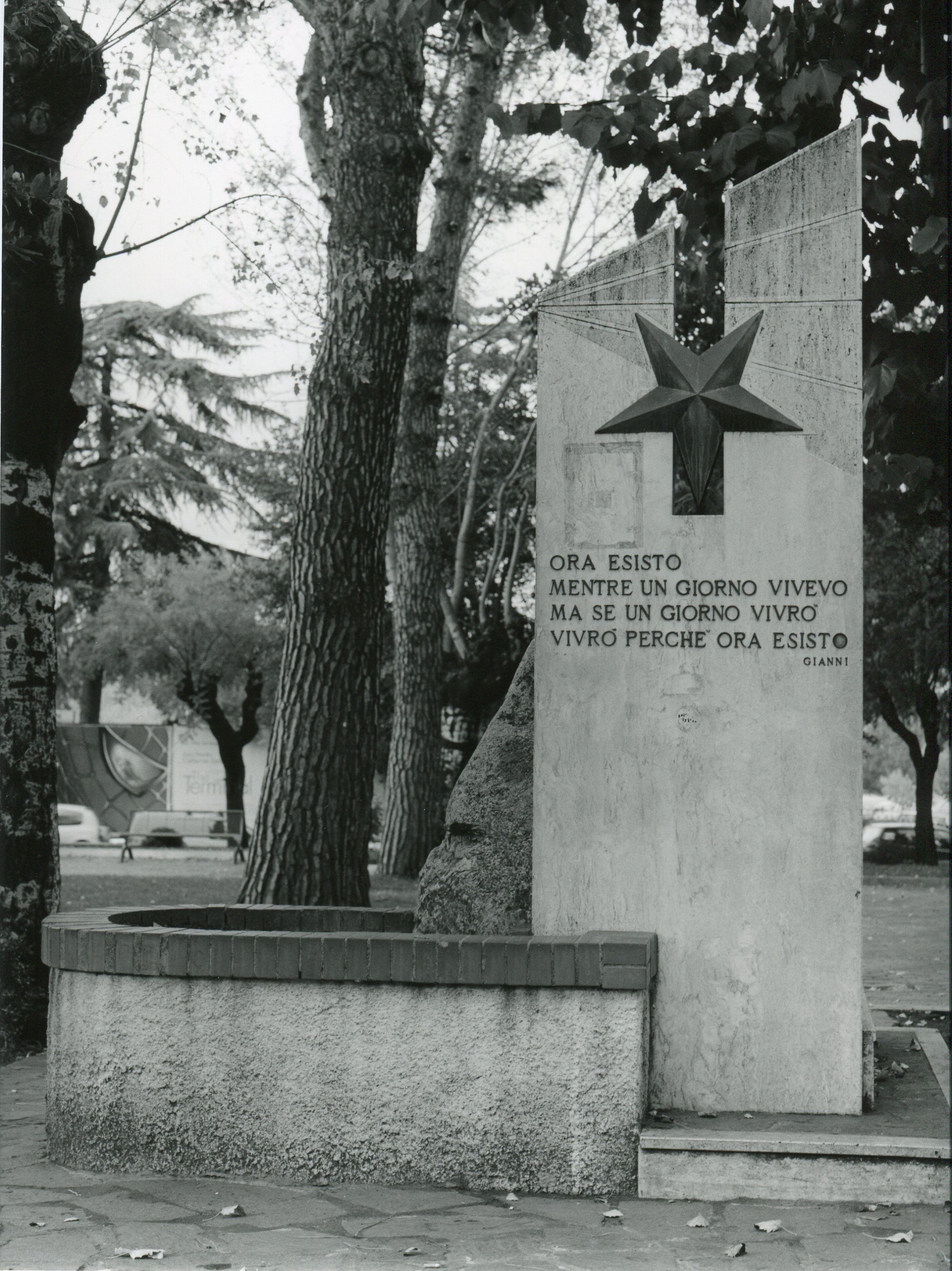 Vasca in muratura che interseca una stele in travertino tagliata obliquamente alla sommità con motivi geometrici. Vi è applicata una stella in bronzo