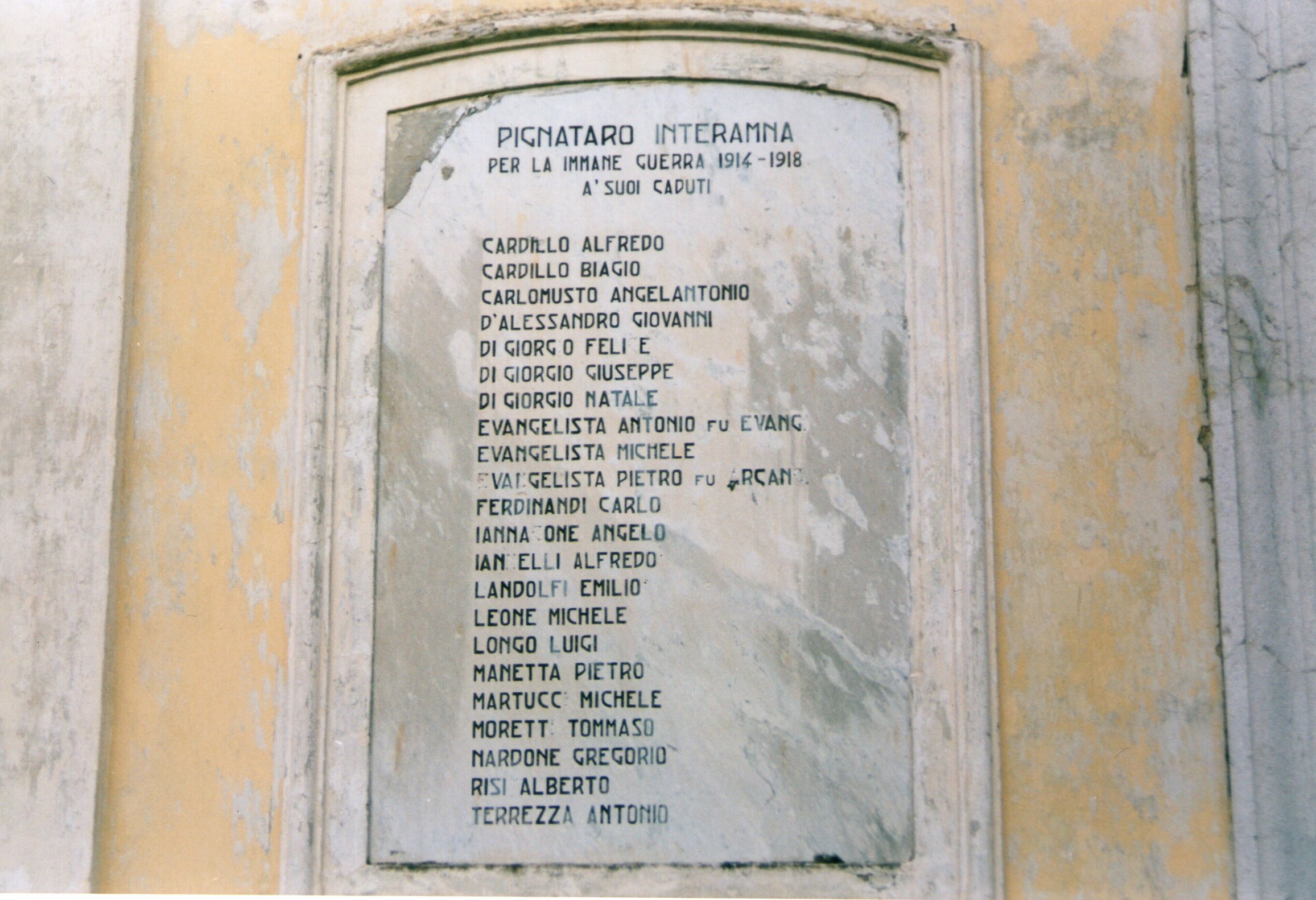 - ISCRIZIONI lapide sinistra - PIGNATARO INTERAMNA/ PER LA IMMANE GUERRA 1914-1918/A' SUOI CADUTI// CARDILLO ALFREDO/ CARDILLO BIAGIO/ CARLOMUSTO ANGELANTONIO/ D'ALESSANDRO GIOVANNI/ DI GIORGIO FELICE/ DI GIORGIO GIUSEPPE/ DI GIORGIO NATALE/ EVANGELISTA ANTONIO FU EVANG./ EVANGELISTA MICHELE/ EVANGELISTA PIETRO FU ARCANG./ FERDINANDI CARLO/ IANNARONE ANGELO/ IANNELLI ALFREDO/ LANDOLFI EMILIO/ LEONE MICHELE/ LONGO LUIGI/ MANETTA PIETRO/ MARTUCCI MICHELE/ MORETTI TOMMASO/ NARDONE GREGORIO/ RISI ALBERTO/ TERREZZA ANTONIO - maiuscolo -