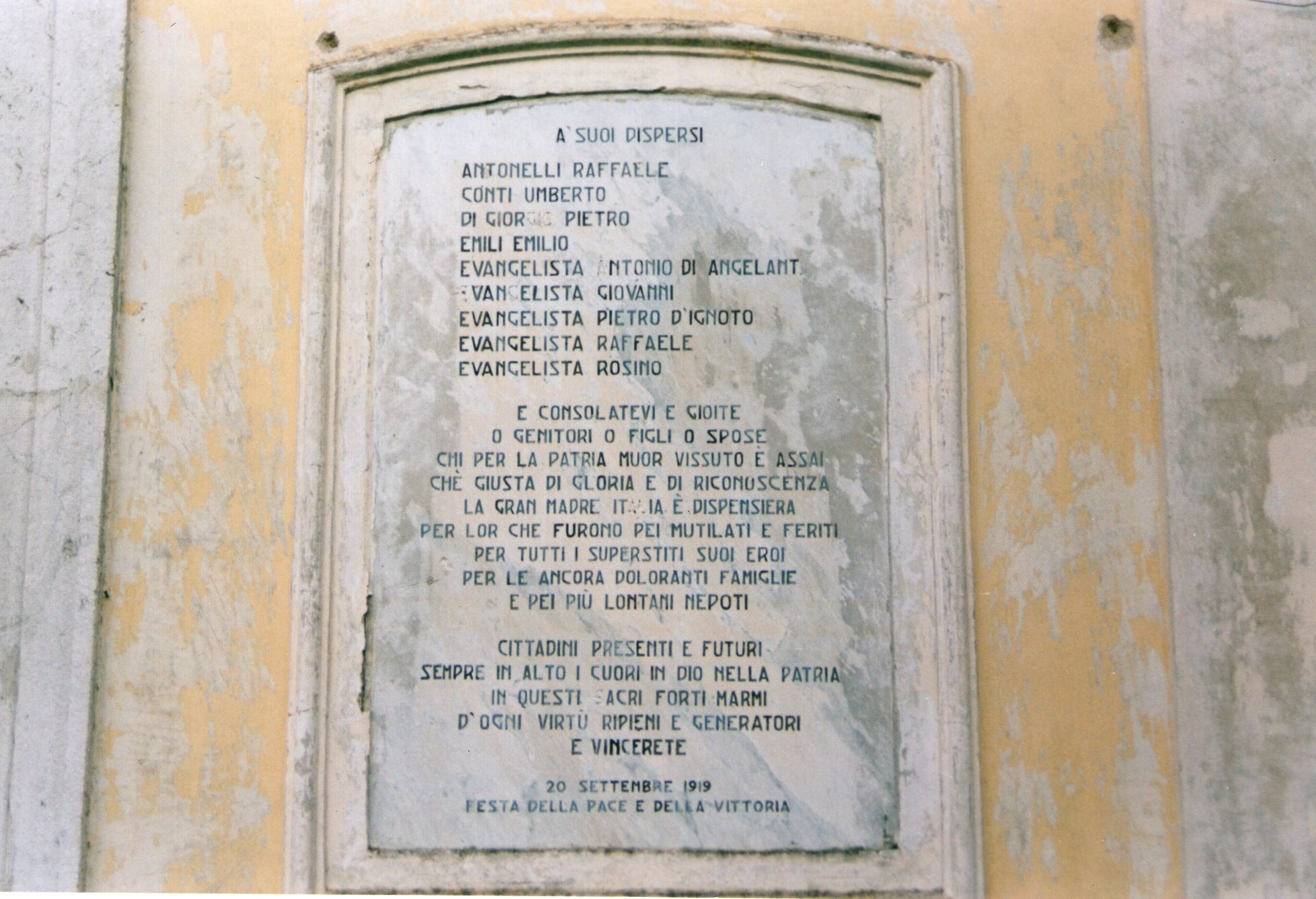 - NOTIZIE STORICO CRITICHE Sulla stessa parete esterna della Chiesa di San Salvatore, accanto alla coppia di lapidi commemorative in questione datate 1919, è stata murata nel 1997 un'altra lapide a ricordo dei caduti della seconda guerra mondiale che decimò la cittadinanza. Quest'ultima veniva a "completare" il monumento ai caduti eretto nel 1965 sullo slargo antistante, testimoniando il sacrificio delle vittime negli anni 1940-45