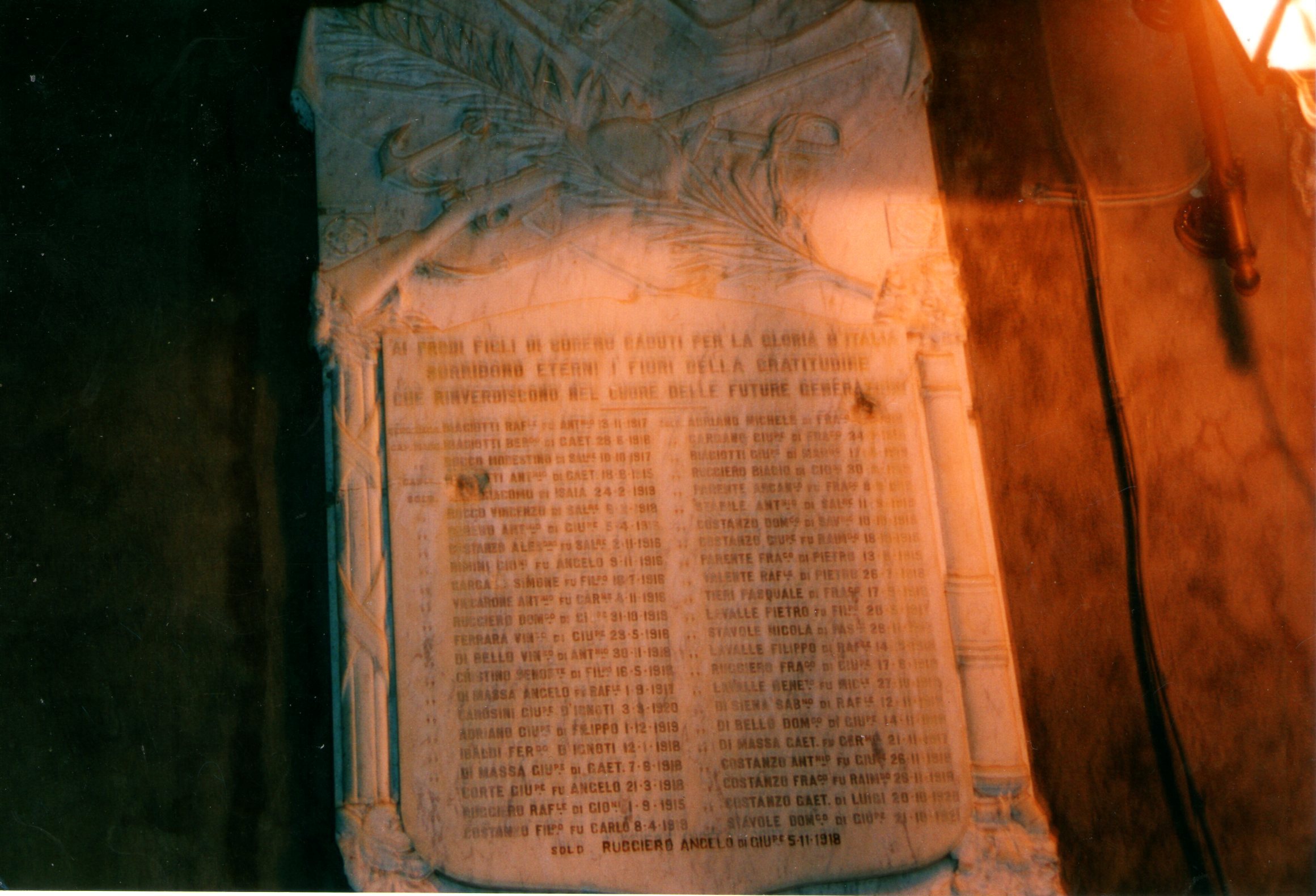 - NOTIZIE STORICO CRITICHE La lapide fu scoperta il 4 novembre 1922 durante una cerimonia organizzata dai reduci di guerra, tra i quali Eliseo Biagiotti ed Oreste Lisi, il sacrestano della Chiesa di S. Margherita. Il parroco don Giona Biagiotti benedì la lapide affissa sulla facciata della chiesa, nonostante la rissa che ebbe luogo tra gli antifascisti di Coreno e i fascisti di Itri della squadra "frà diavolo" che provocarono lo scontro armati di manganelli (notizie fornite dalla pro-loco). Di esecuzione pregevole la decorazione a rilievo: il repertorio iconografico consueto viene reso con sapienza compositiva e attenzione alla resa materica e chiaroscurale. Degna di nota anche l'iscrizione, dalla retorica incisiva e accurata