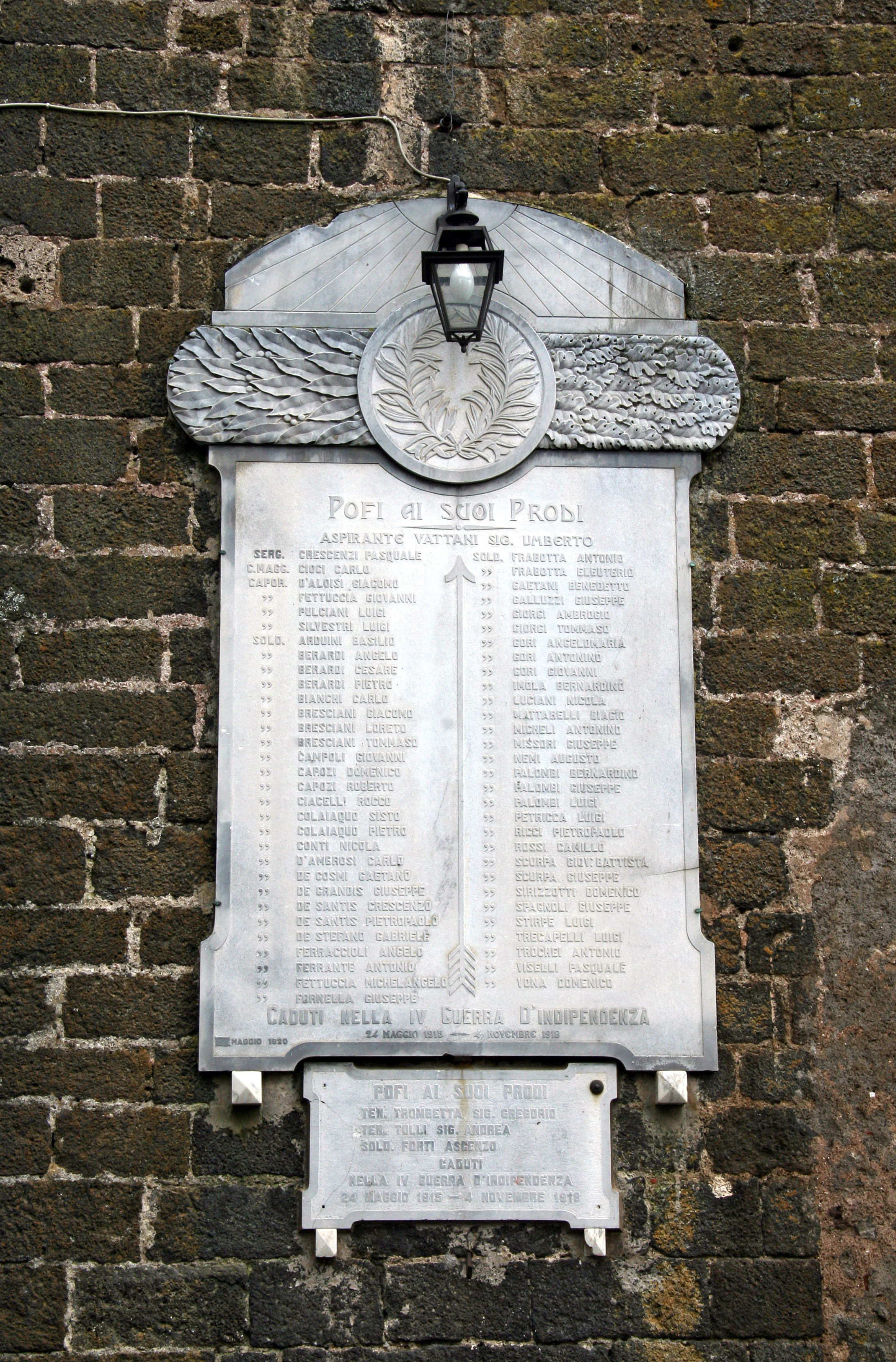 - ISCRIZIONI NEL CAMPO - POFI AI SUOI PRODI/ TEN. TROMBETTA SIG. GREGORIO/ TEN. TOLLI SIG. ANDREA/ SOLD. FORTI ASCENZO/ CADUTI/ NELLA IV GUERRA D'INDIPENDENZA/ 24 MAGGIO 1915 - 4 NOVEMBRE 1918 - maiuscolo - a rilievo -