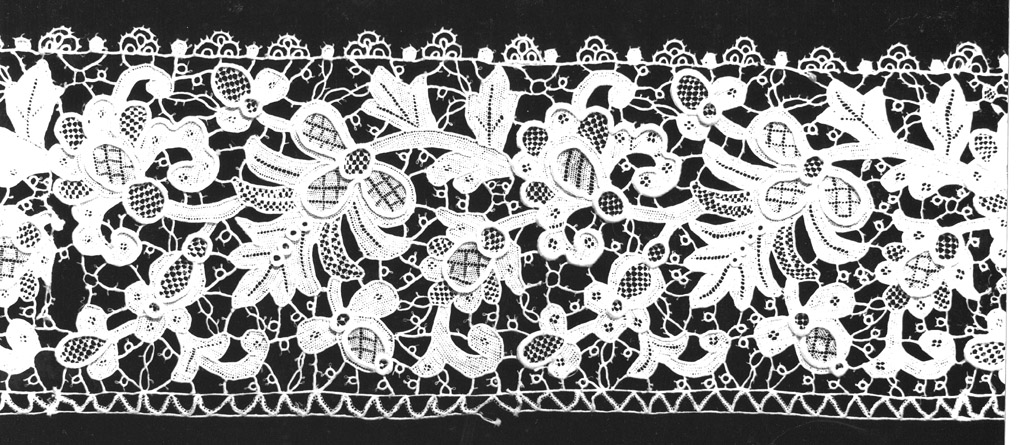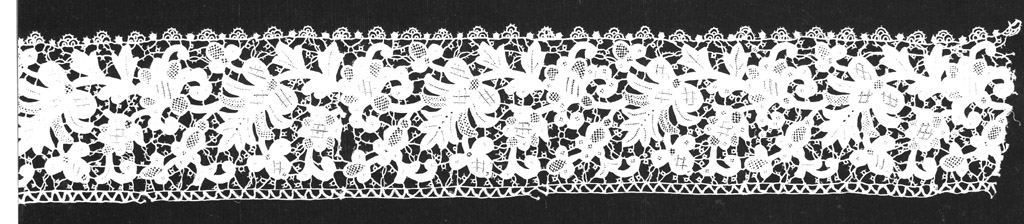 Merletto interamente eseguio ad ago con la tecnica seicentesca del punto di Venezia a rilievo o punto tagliato di venezia, con un motivo a ghirlanda fiorita e foglie
