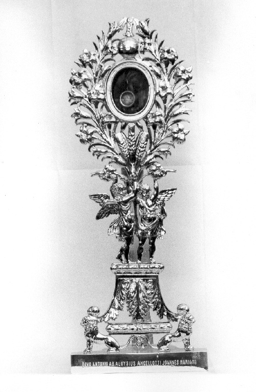 Base con figure metà umane e animali; fusto a foglie e al di sopra angioletti sorreggono il ricettacolo floreale. Teca a luce ovale