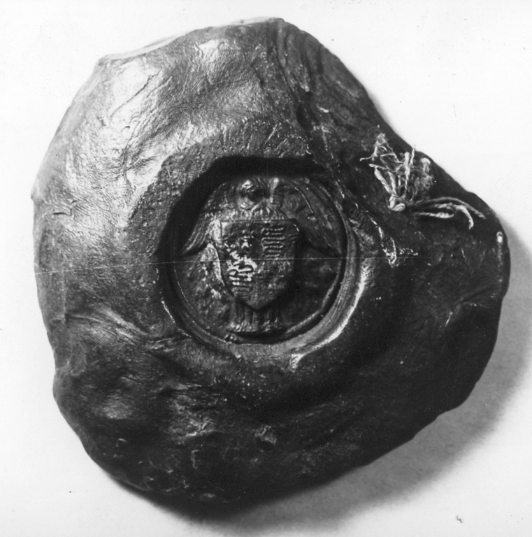 Impronta di sigillo e controsigillo circolare con sul recto cavaliere armato, l'elmo chiuso con giglio araldico come cimiero, nella destra spada sagomata, nella sinistra scudo inquartato; nel primo e nel quarto, tre gigli posti 2, 1; nel secondo e nel terzo, biscia ondeggiante in palo e ingollante un fanciullo, su cavallo al galoppo con gualdrappa ornata delle armi del cavaliere; il campo seminato di gili di Francia; la leggenda in lettere....., è compresa entro filetti. Mentre sul verso su di un campo seminato di gigli di Francia, scudo inquartato; nel primo e nel quarto, tre gigli posti 2, 1; nel secondo e nel terzo, biscia ondeggiante in palo e ingollante un fanciullo; lo scudo è accollato ad un angelo alato stante di fronte, nimbato