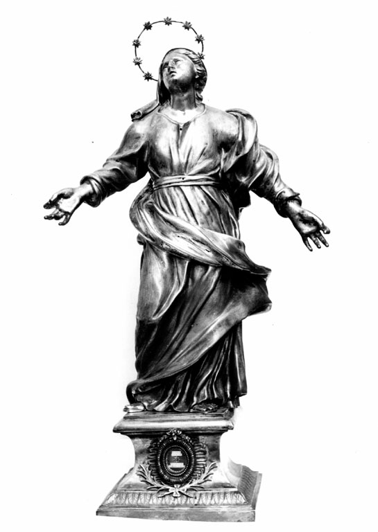 sul piedistallo decorato da cornice modanata e cornice a palmette con teca a luce ovale contenente la reliquia, è posta la statuetta della Madonna Addolorata