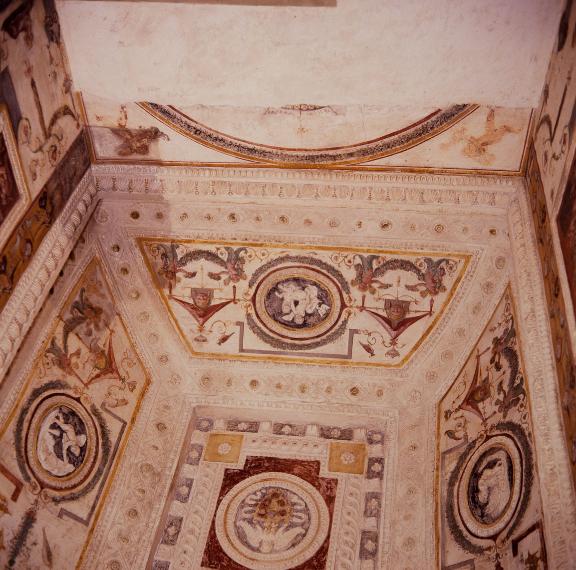 la volta vicino l'ingresso presenta nella parte centrale, tra rosette in stucco e fasce, tre rilievi con stemmi medicei, del castellano Guido de Medici e papa Clemente VII. Lo stemma centrale è sormontato dalle chiavi apostoliche e dalla tiara, gli altri due sono in uno scudo retto da un angelo recante sul petto una croce. Lungo i lati della volta, sei medaglioni ovali in stucco dipinto raffigurano Amorini con animali marini
