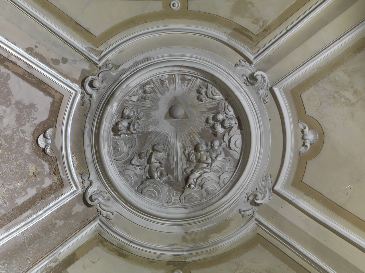 Le quattro vele sono caratterizzate da una cornice a listello in rilievo. Le due vele laterali presentano sul lato breve un motivo a volute, mentre quelle longitudinali, larghe e strette, sono ornate da un bottone. Al centro si trova il clipeo con rilievo