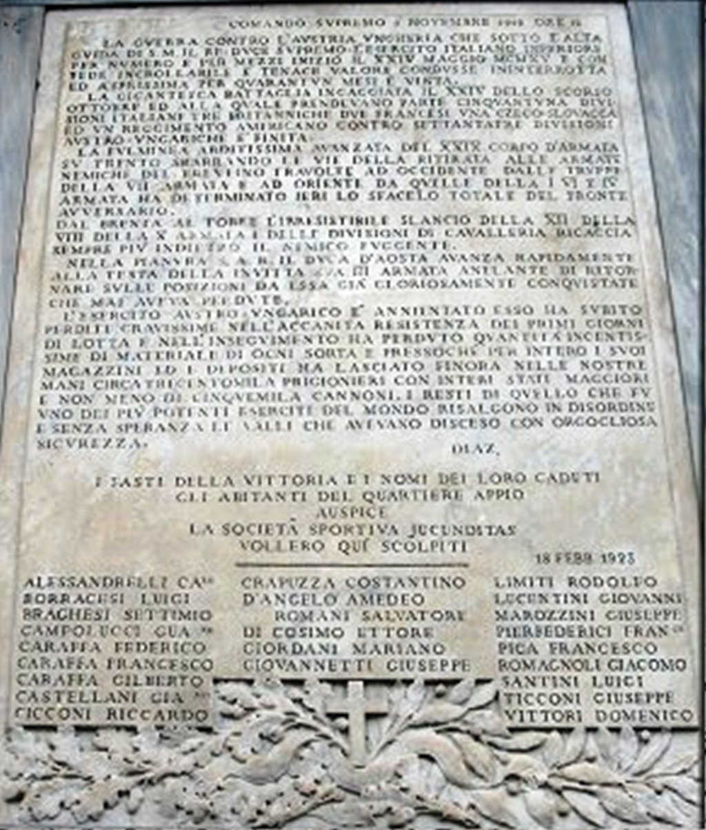 - ISCRIZIONI sulla lapide - COMANDO SVPREMO 5 NOVEMBRE 1918 ORE 12/ LA GVERRA CONTRO L'AVSTRIA VNGHERIA CHE SOTTO L'ALTA/ GVIDA DI S.M. IL RE-DVCE SVPREMO- L'ESERCITO ITALIANO INFERIORE/ PER NVMERO E PER MEZZI INIZIÒ IL XXIV MAGGIO MCMXV E CON/ FEDE INCROLLABILE E TENACE VALORE CONDVSSE ININTERROTTA/ ED ASPRISSIMA PER QVARANTVN MESI, E' VINTA./ LA GIGANTESCA BATTAGLIA INGAGGIATA IL XXIV DELLO SCORSO/ OTTOBRE ED ALLA QVALE PRENDEVANO PARTE CINQVANTVNA DIVI-/ SIONI ITALIANE TRE BRITANNICHE DVE FRANCESI VNA CZECO-SLOVACCA/ ED VN REGGIMENTO AMERICANO CONTRO SETTANTATRE DIVISIONI/ AVSTRO-VNGARICHE E' FINITA./ LA FVLMINEA ARDITISSIMA AVANZATA DEL XXIX CORPO D'ARMATA/ SV TRENTO SBARRANDO LE VIE DELLA RITIRATA ALLE ARMATE/ NEMICHE DEL TRENTINO TRAVOLTE AD OCCIDENTE DALLE TRVPPE/ DELLA VII ARMATA E AD ORIENTE DA QVELLE DELLA I VI E IV/ ARMATA HA DETERMINATO IERI LO SFACELO TOTALE DEL FRONTE/ AVVERSARIO./ DAL BRENTA AL TORRE L'IRRESISTIBILE SLANCIO DELLA XII DELLA/ VIII DELLA X ARMATA E DELLE DIVISIONI DI CAVALLERIA RICACCIA/ SEMPRE PIV' INDIETRO IL NEMICO FVGGENTE./ NELLA PIANVRA S.A.R. IL DVCA D'AOSTA AVANZA RAPIDAMENTE/ ALLA TESTA DELLA INVITTA SVA III ARMATA ANELANTE DI RITOR-/ NARE SVLLE POSIZIONI DA ESSA GIÀ GLORIOSAMENTE CONQVISTATE/ CHE MAI AVEVA PERDVTE./ L'ESERCITO AVSTRO-VNGARICO È ANNIENTATO ESSO HA SVBITO/ PERDITE GRAVISSIME NELL'ACCANITA RESISTENZA DEI PRIMI GIORNI/ DI LOTTA E NELL'INSEGVIMENTO HA PERDVTO QVANTITÀ INGENTIS-/ SIME DI MATERIALE DI OGNI SORTA E PRESSOCHÈ PER INTERO I SVOI/ MAGAZZINI ED I DEPOSITI HA LASCIATO FINORA NELLE NOSTRE/ MANI CIRCA TRECENTOMILA PRIGIONIERI CON INTERI STATI MAGGIORI/ E NON MENO DI CINQVEMILA CANNONI. I RESTI DI QVELLO CHE FV/ VNO DEI PIÙ POTENTI ESERCITI DEL MONDO RISALGONO IN DISORDINE/ E SENZA SPERANZA LE VALLI CHE AVEVANO DISCESO CON ORGOGLIOSA/ SICVREZZA.// DIAZ// I FASTI DELLA VITTORIA E I NOMI DEI LORO CADUTI/ GLI ABITANTI DEL QUARTIERE APPIO/ AUSPICE/ LA SOCIETÀ SPORTIVA JUCUNDITAS/ VOLLERO QUI SCOLPITI// 18 FEBBR. 1923// ALESSANDRELLI CA.LO/ BORRACESI LUIGI/ BRAGHESI SETTIMIO/ CAMPOLUCCI GUA.RO/ CARAFFA FEDERICO/ CARAFFA FRANCESCO/ CARAFFA GILBERTO/ CASTELLANI GIA.MO/ CICCONI RICCARDO// CRAPUZZA COSTANTINO/ D'ANGELO AMEDEO/ ROMANI SALVATORE/ DI COSIMI ETTORE/ GIORDANI MARIANO/ GIOVANNETTI GIUSEPPE/ LIMITI RODOLFO/ LUCENTINI GIOVANNI/ MAROZZINI GIUSEPPE/ PIERFEDERICI FRAN.CO/ PICA FRANCESCO/ ROMAGNOLI GIACOMO/ SANTINI LUIGI/ TICCONI DOMENICO/ VITTORI DOMENICO - caratteri vari -