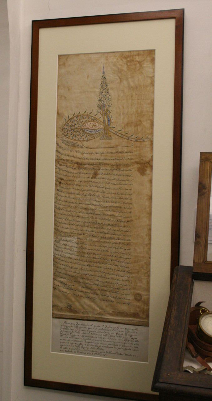 - NOTIZIE STORICO CRITICHE La seguente traduzione del contenuto del doumento è su un foglio applicato sotto il margine inferiore: Firmano imperiale col quale il sultano di Costantinopoli, ad esempio dell’operato dai suoi predecessori Sultano Ahmed e fratello suo Sultano Osman, accordava nei giorni di mezzo del mese di Rebi-ulevvel dell’anno dell’Egira 1039, alla Repubblica di Ragusa, rappresentata dai plenipotenziari Signori De Nicola e Domenico facoltà di accesso e di commercio negli stati ottomani ai negozianti Ragusei con le usate promesse di parecchie immunità e guarentigia personale, di esenzione da pedaggi, da tasse, da estorsioni degli Agenti della porta. Il tutto a condizione di continuare alla Sublime Porta l’usato annuo tributo di Fiorini d’oro 12.000,00. La carta su cui miniatura e testo sono scritti, vergata, sembra essere di importazione occidentale