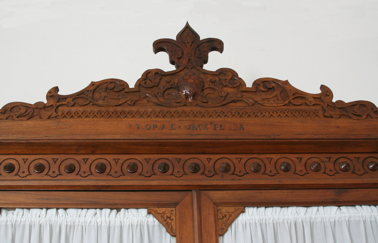 - NOTIZIE STORICO CRITICHE La vetrina fa coppia con un'altra identica e risulta donata dal socio corrispondente Leopoldo Traversi (1856-1949). Dall'iscrizione presente in alto si evince che fosse destinata a contenere oggetti provenienti dall'Etiopia e dal Congo Belga. Una delle due vetrine è presente in una fotografia della Guida del museo edita nel 1958, ancora priva delle tendine di tessuto