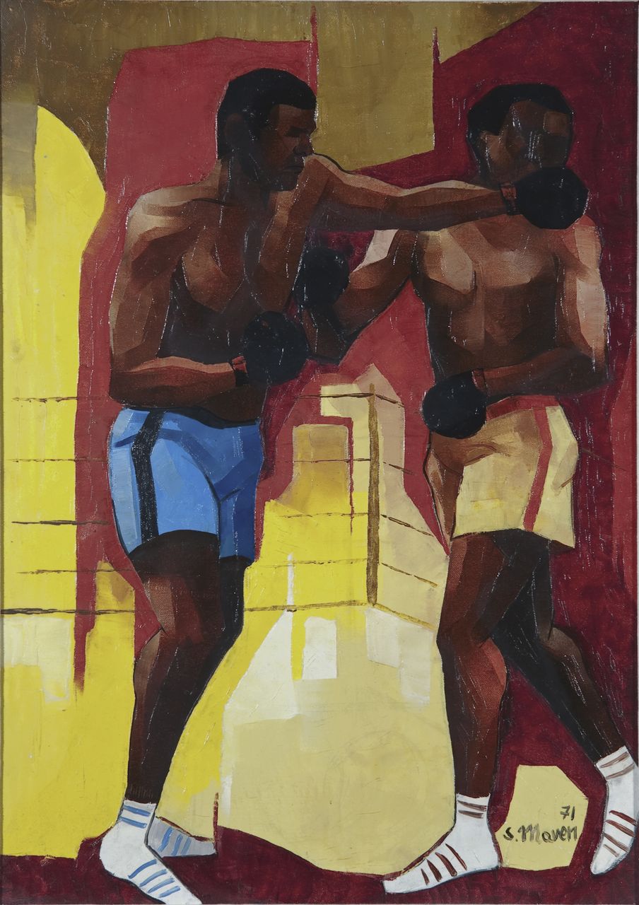 Due pugili occupano tutta l'altezza del dipinto. Dietro, le corde del ring dipinte contro un luminoso sfondo giallo. Dipinto caratterizzato da nette campiture di colore, steso con l'ausilio di una spatola