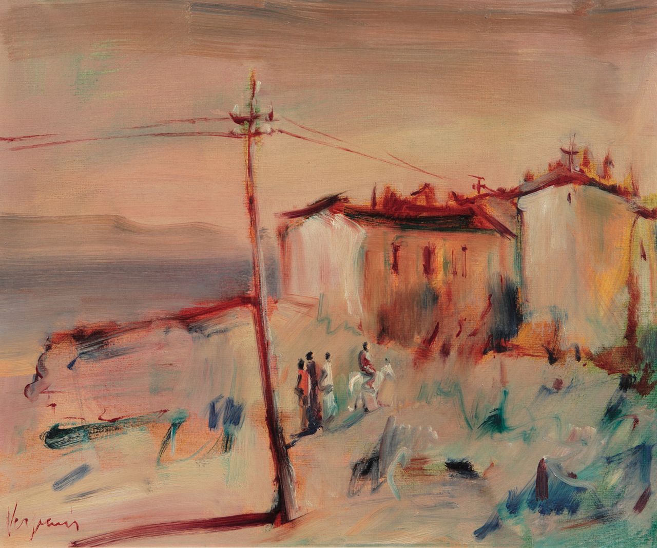Alcune case sulla destra delimitano una piazza in cui si distinguono figure in movimento, a dorso di un asino e a piedi. All'incirca a metà è un palo elettrico