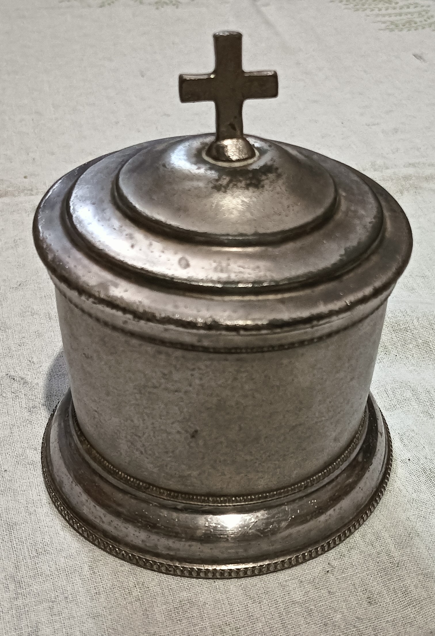 pisside da viatico di piccole dimensioni con coperchio concluso dalla croce