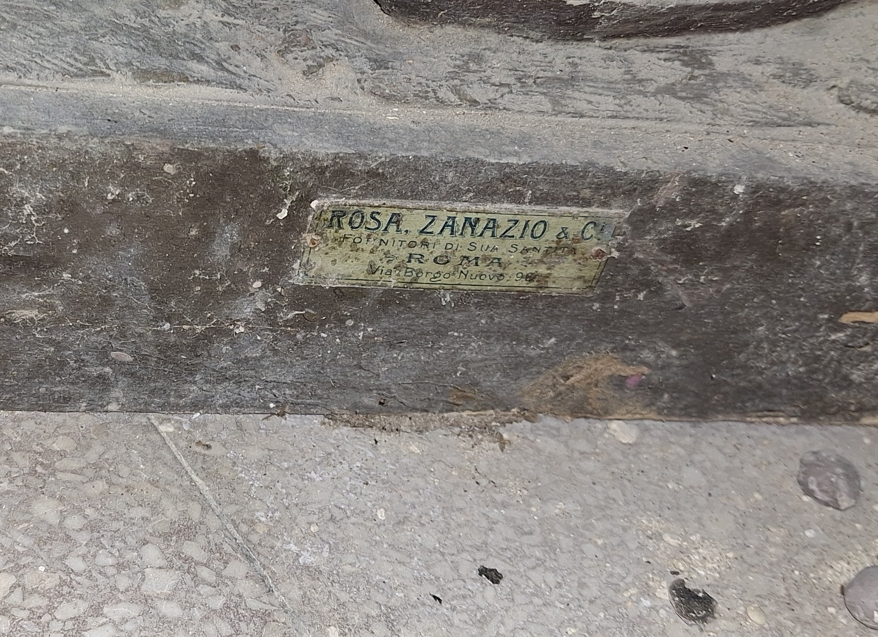 • ISCRIZIONI sulla targhetta sul lato destro della base - ROSA, ZANAZIO & C.I/ FORNITORI DI SUA SANTITÀ/ ROMA/ Via Borgo Nuovo, 96 - maiuscolo/ minuscolo/ numeri arabi -