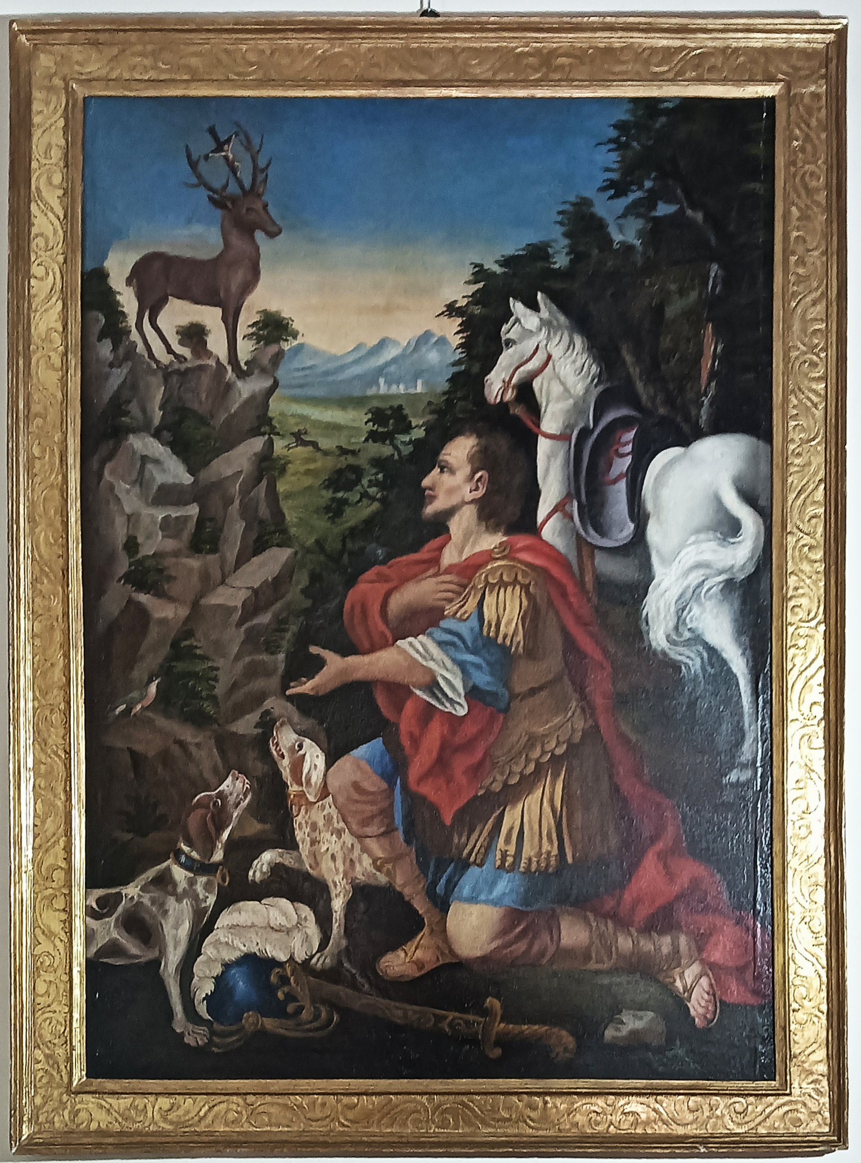 in primo piano campeggia la figura di Sant'Eustachio rapito dalla visione del cervo