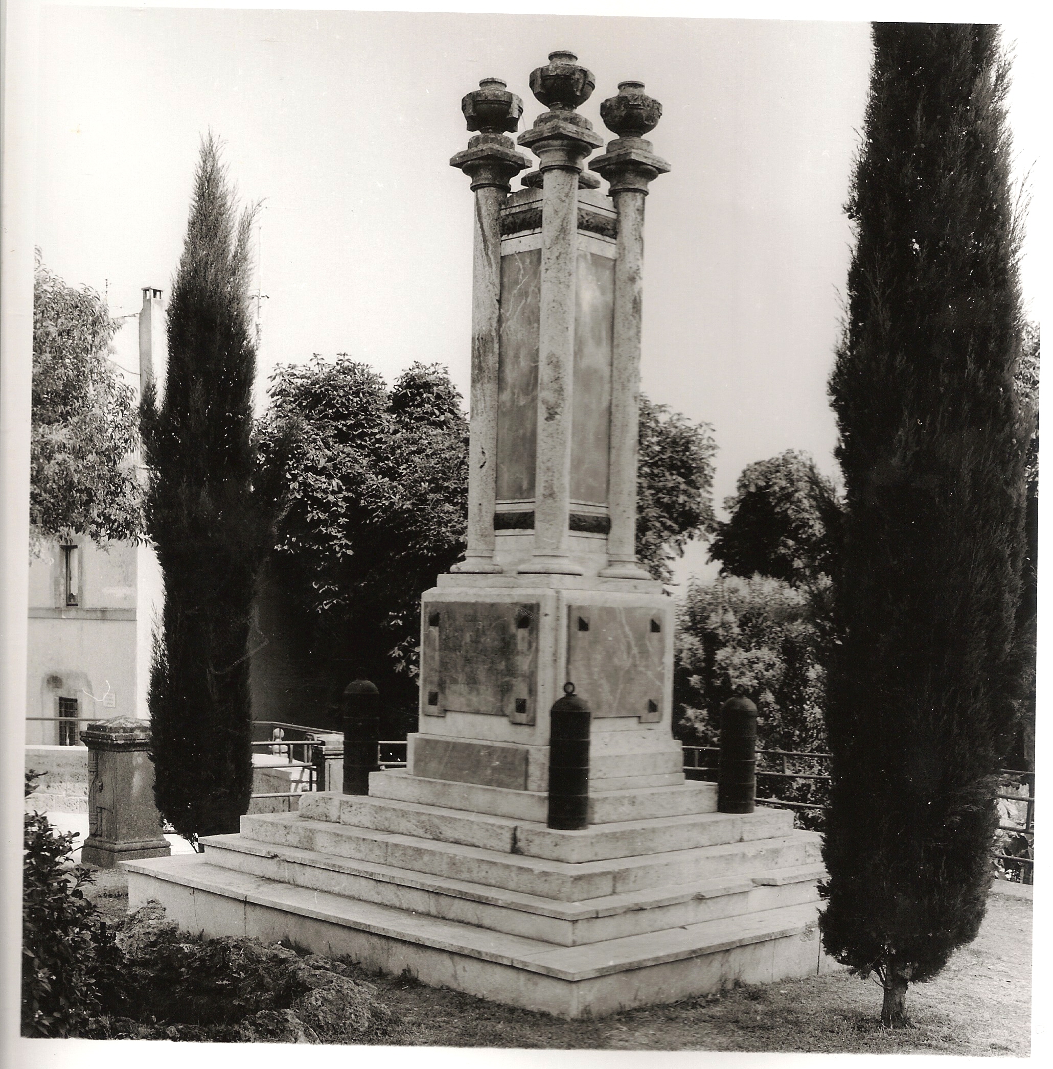 base rettangolare a 5 gradini, nel penultimo 4 colonnine in bronzo angolari passa catena (mancante); dado in marmo con targhe applicate in bronzo su cui si erge un parallelepipedo posto in altezza con 4 colonnine angolari che sorreggono 4 urne cinerarie
