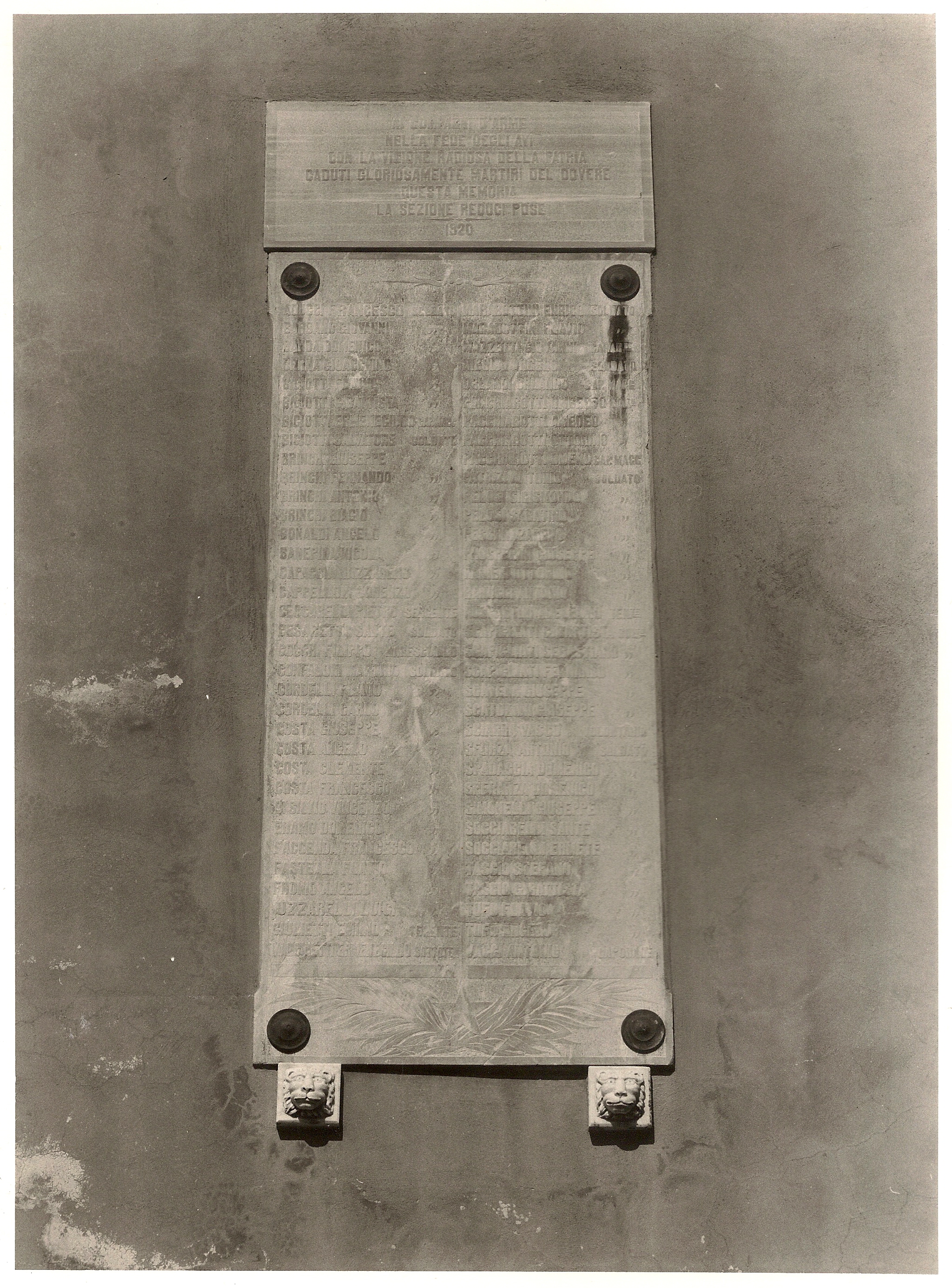 - ISCRIZIONI lapide superiore - AI COMPAGNI D'ARME/ NELLA FEDE DEGLI AVI/ CON LA VISIONE RADIOSA DELLA PATRIA/ CADUTI GLORIOSAMENTE MARTIRI DEL DOVERE/ QUESTA MEMORIA/ LA SEZIONE REDUCI POSE/ 1920 - maiuscolo -