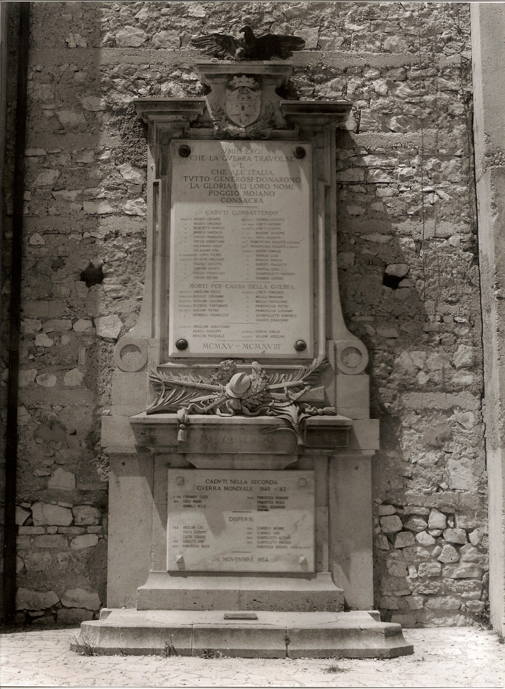 - ISCRIZIONI a tutto campo - VMILI EROI / CHE LA GVERRA TRAVOLSE / E / CHE ALL' ITALIA / TUTTO GENEROSI DONARONO / LA GLORIA DEI LORO NOMI / POGGIO MOIANO / CONSACRA / CADVTI COMBATTENDO / SOLDATO BASILIO LIBERATO/ " BASILIO VINCENZO/ " BENEDETTI RANIERO/ " BIANCHI VINCENZO/ " COCCIA FRANCESCO/ " COCCIA SEBASTIANO/ " COLASANTI CARLO/ COLASANTI VITO/ [...] MORTI PER CAVSA DELLA GUERRA / SOLDATO ANGELONI ROCCO/ BASILICI GIOVANNI/ [...] // SOLDATO ANGELONI SEBASTIANO/ " AURELI GIUSEPPE/ " BRACONI PASQUALE// CAPORALE COCCIA EMILIO/ SOLDATO VILLANO ANSELMO// MCMXV - MCMXVIII - caratteri vari -