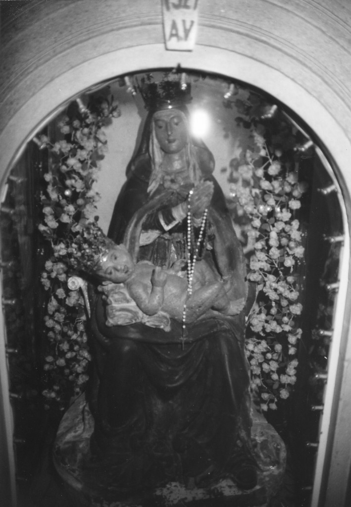 Madonna incoronata, orante, seduta, con Gesu' Bambino nudo sdraiato sulle sue gambe