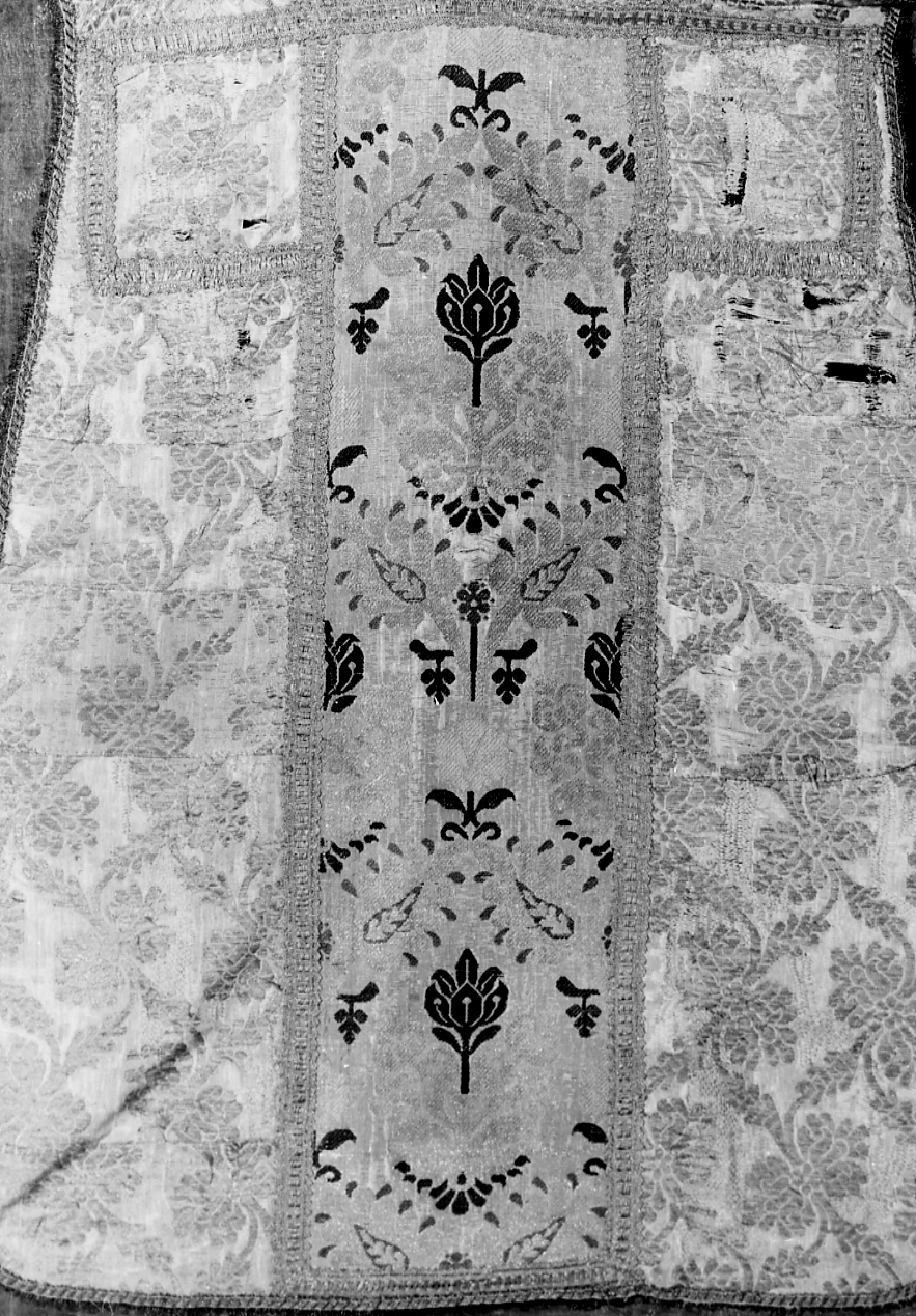 - NOTIZIE STORICO CRITICHE L'impanto modulare della composizione e la stilizzazione degli elementi naturalistici ci suggeriscono la datazione suindicata. Questa tipologia tessile, codificata in soluzioni "classiche", è stata utilizzata nella confezione di vesti sacre e nell'arredamento per più di un secolo
