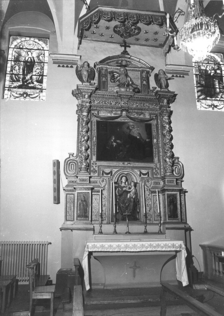Sistema compositivo su tre ordini: due colonne tortili avvolte in senso contrario. Alla sommità rilievo raffigurante l'Eterno Padre in forte aggetto tra due puttini ai lati. Sui pilastrini che sorreggono le colonnine dipinti su tela. Al centro in basso nicchia con una Madonna in trono e al centro in basso nicchia con una Madonnina in trono e al centro tela dipinta. Sul soffitto baldacchino ligneo