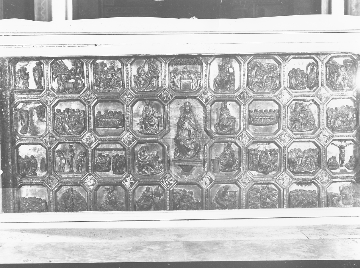 IL PALIOTTO E' FORMATO DI 83 SCOMPARTI COSI' SUDDIVISI: 35 GRUPPI A CESELLO E RIMBALZO; 22 QUADRETTI CON PITTURE A SMALTO; 26 ORNATI TRIANGOLARI SMALTATI. 209 SONO LE FIGURE E 21 LE INCISIONI. LE FORMELLE INIZIANO LA NARRAZIONE DALL'ANNUNCIAZIONE ALLA VERGINE E TERMINANO CON LA FONDAZIONE DELLA CHIESA. NEL MEZZO SIEDE GESU' BENEDICENTE CHE CON LA SINISTRA TIENE APERTO IL LIBRO DEGLI EVANGELI