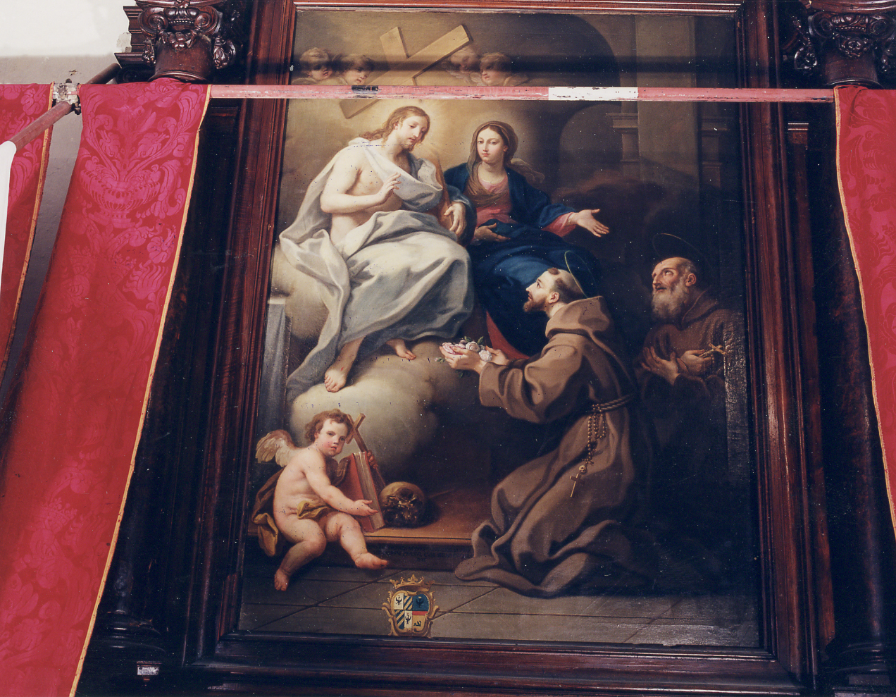 PERSONAGGI: SAN FRANCESCO D'ASSISI; CRISTO; MADONNA. FIGURE: SANTO FRANCESCO; ANGIOLETTO; CHERUBINI. ATTRIBUTI: (SAN FRANCESCO D'ASSISI) CROCIFISSO; TESCHIO; LIBRO. OGGETTI: CROCE; FIORI