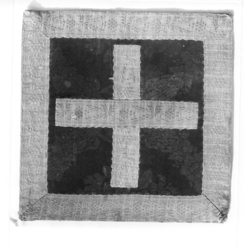 - NOTIZIE STORICO CRITICHE Il tessuto, realizzato per uso ecclesiastico come denunciano i riferimenti simbolici, è attribuibile al periodo proposto sia per gli schemi disegnativi legati al passato che per l'utilizzo di filato meno pregiato