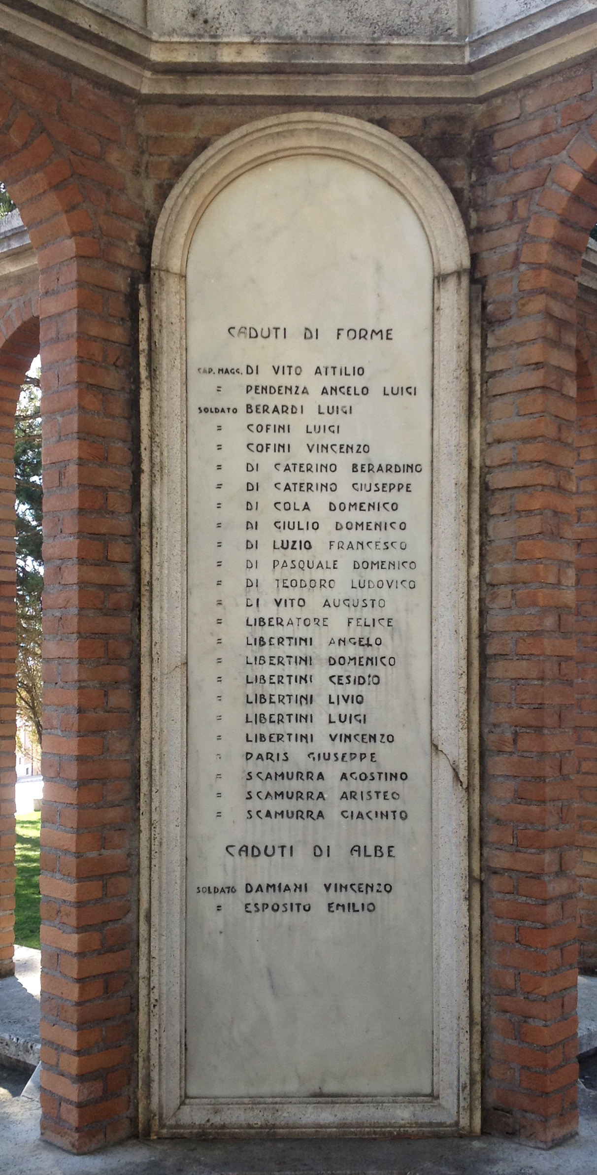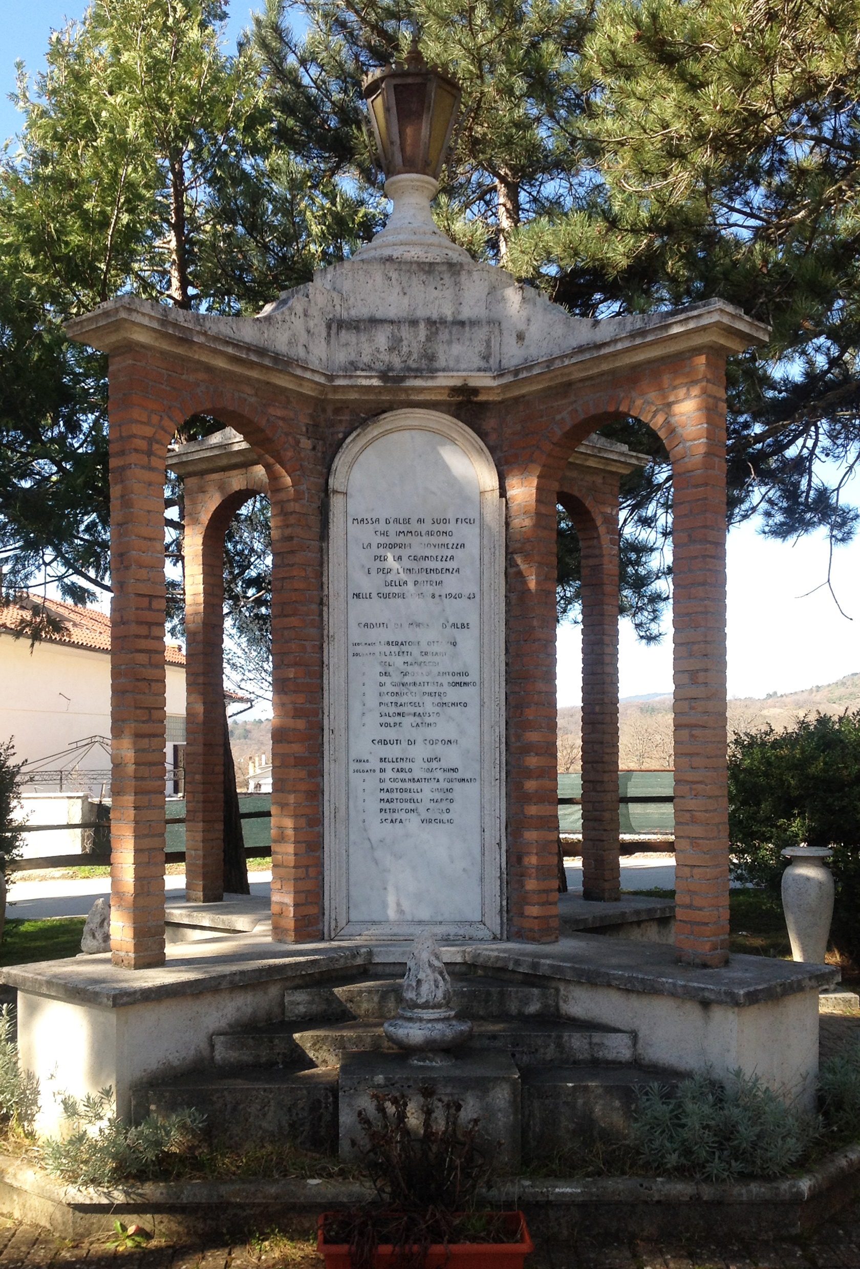 - ISCRIZIONI lato frontale del monumento - MASSA D’ALBE AI SUOI FIGLI CHE IMMOLARONO LA PROPRIA GIOVINEZZA PER LA GRANDEZZA E PER L’INDIPENDENZA DELLA PATRIA NELLE GUERRE 1915.18 – 1940.43/ CADUTI DI MASSA D’ALBE/ SERG. MAGG. LIBERATORE OTTAVIO/ SOLDATO BLASETTI ERNANI/ CELI MANFREDI/ DEL GROSSO ANTONIO/ DI GIOVANBATTISTA DOMENICO/ IACOBUCCI PIETRO/ PIETRANGELI DOMENICO/ SALONE FAUSTO/ VOLPE LATINO/ CADUTI DI CORONA/ CARAB. BELLENZIO LUIGI/ SOLDATO DI CARLO GIOACCHINO/ DI GIOVANBATTISTA FORTUNATO/ MARTORELLI GIULIO/ MARTORELLI MARCO/ PETRICONE CARLO/ SCAFATI VIRGILIO - corsivo maiuscolo - a incisione - italiano