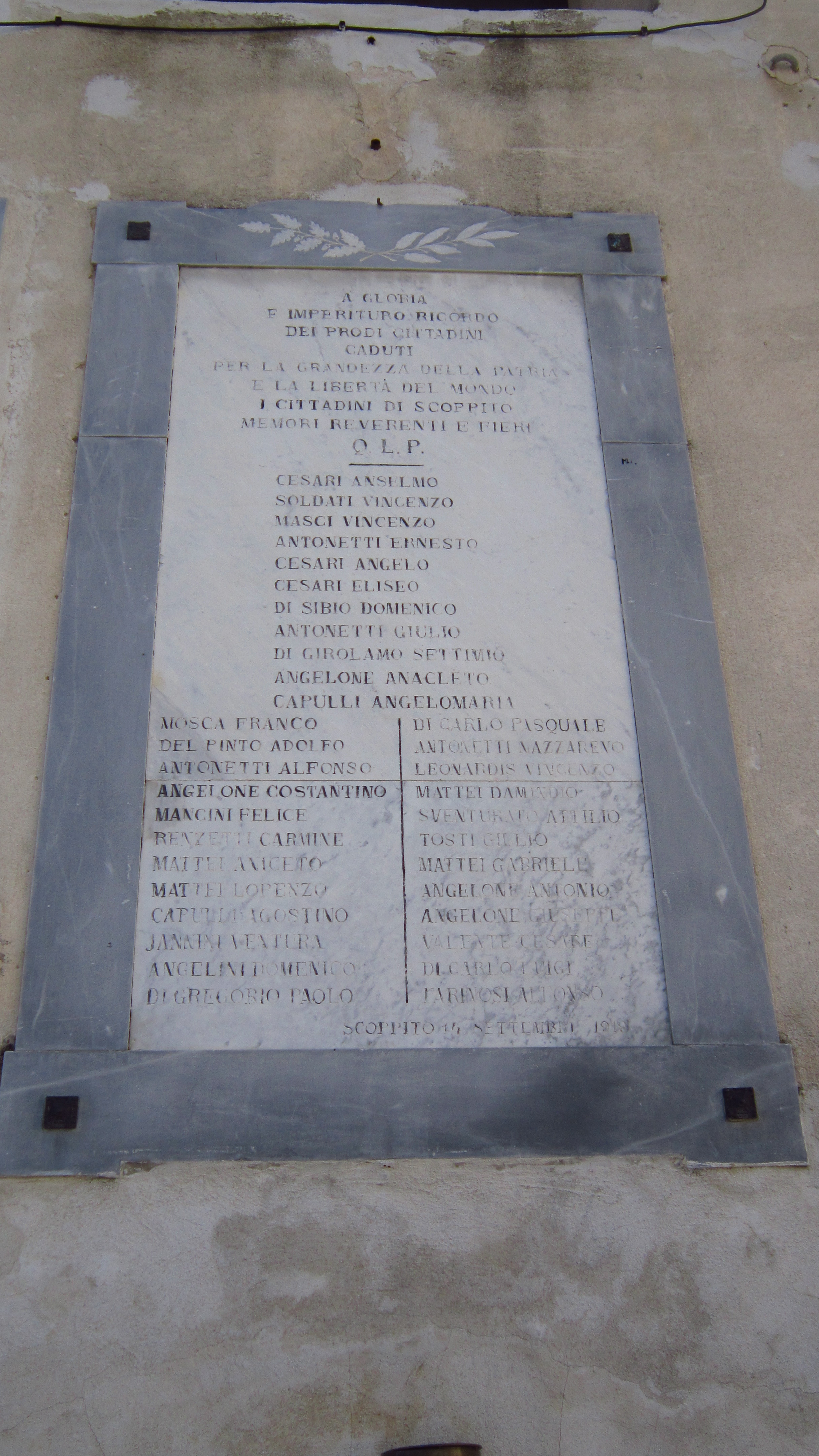 - ISCRIZIONI Nel corpo della lapide - A gloria/ e imperituro ricordo/ dei prodi cittadini/ caduti/ per la grandezza della patria/ e la libertà del mondo/ i cittadini di Scoppito/ memori reverenti e fieri/ Q.L.P. CESARI ANSELMO/ SOLDATI VINCENZO/ MASCI VINCENZO/ANTONETTI ERNESTO/ CESARI ANGELO/ CESARI ELISEO/ DI SIBIO DOMENICO/ ANTONETTI GIULIO/ DI GIROLAMO SETTIMO/ ANGELONE ANACLETO/ CAPULLI ANGELOMARIA/ MOSCA FRANCO/ DEL PINTO ADOLFO/ ANTONETTI ALFONSO/ ANGELONE COSTANTINO/ MANCINI FELICE/ RENZETTI CARMINE/ MATTEI LORENZO/ MATTEI LORENZO/ CAPULLI AGOSTINO/ JANNINI VENTURA/ ANGELINI DOMENICO/ DI GREGORIO PAOLO/ DI CARLO PASQUALE/ ANTONELLI NAZZARENO/ LEONARDIS VINCENZO/ MATTEI DAMIANO/ SVENTURATO ATTILIO/ TOSTI GIULIO/ MATTEI GABRIELE/ ANGELONE ANTONIO/ ANGELONE GIUSEPPE/ VALENTE CESARE/ DI CARLO LUIGI/ FARINOSI ANTONIO -