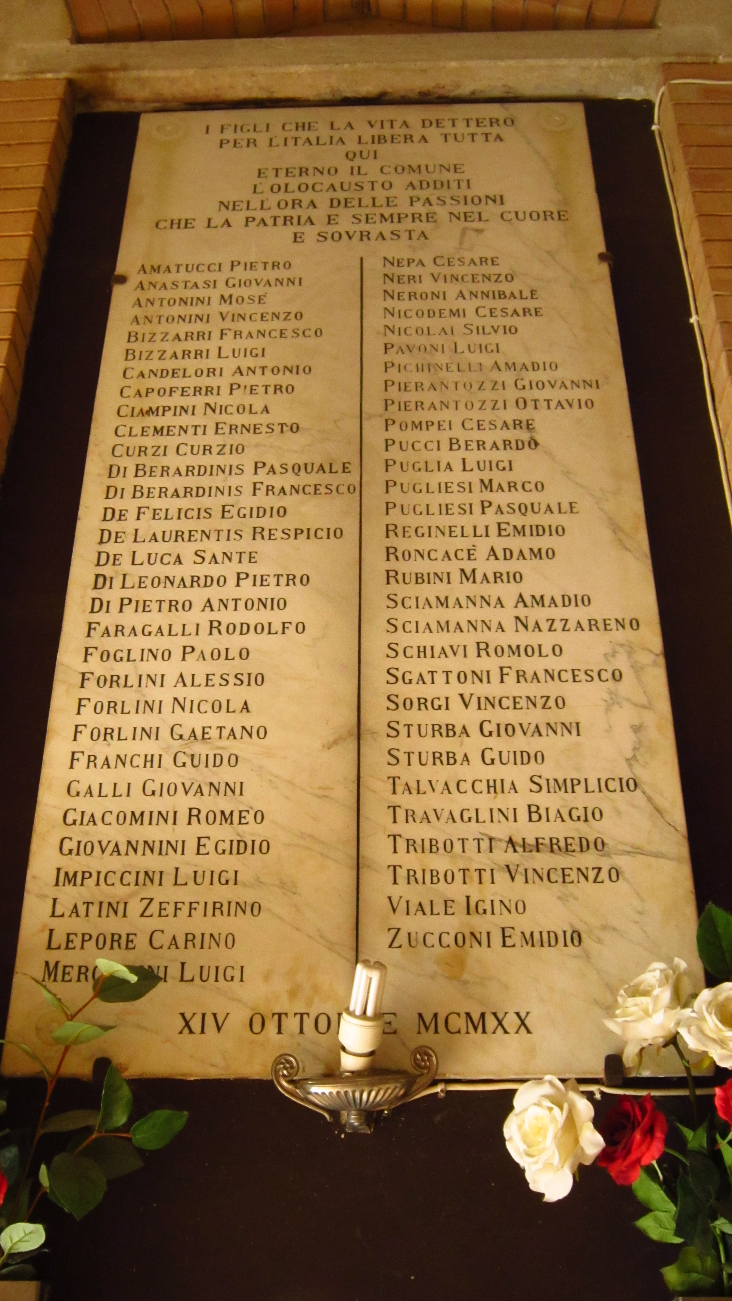 - ISCRIZIONI Sulla lapide - I FIGLI CHE LA VITA DETTERO/ PER L'ITALIA LIBERA TUTTA/ QUI/ ETERNO IL COMUNE/ L'OLOCAUSTO ADDITI/ NELL'OR DELLE PASSIONI/ CHE LA PATRIA E SEMPRE NEL CUORE/ E SOVRASTA/ AMATUCCI PIETRO/ ANASTASI GIOVANNI/ ANTONINI MOSE'/ ANTONINI VINCENZO/ BIZZARRI FRANCESCO/ BIZZARRI LUIGI/ CANDELORI ANTONIO/ CAPOFERRI PIETRO/ CIAMPINI NICOLA/ CLEMENTI ERNESTO/ CURZI CURZIO/ DI BERARDINIS PASQUALE/ DI BERARDINIS FRANCESCO/ DE FELICIS EGIDIO/ DE LAURENTIS RESPICIO/ DE LUCA SANTE/ DI LEONARDO PIETRO/ DI PIETRO ANTONIO/ FARAGALLI RODOLFO/ FOGLINO PAOLO/ FORLINI ALESSIO/ FORLINI NICOLA/ FORLINI GAETANO/ FRANCHI GUIDO/ GALLI GIOVANNI/ GIACOMINI ROMEO/ GIOVANNINI EGIDIO/ IMPICCINI LUIGI/ LATINI ZEFFIRINO/ LEPORE CARINO/ [...] LUIGI/ NEPA CESARE/ NERI VINCENZO/ NERONI ANNIBALE/ NICODEMI CESARE/ NICOLAI SILVIO/ PAVONI LUIGI/ PICHINELLI AMADIO/ PIERANTOZZI GIOVANNI/ PIERANTOZZI OTTAVIO/ POMPEI CESARE/ PUCCI BERARDO/ PUGLIA LUIGI/ PUGLIESI MARCO/ PUGLIESI PASQUALE/ REGINELLI EMIDIO/ RONCACE' ADAMO/ RUBINI MARIO/ SCIAMANNA NAZZARENO/ SCIAMANNA AMADIO/ SCHIAVI ROMOLO/ SGATTONI FRANCESCO/ SORGI VINCENZO/ STURBA GIOVANNI/ STURBA GUIDO/ TALVACCHIA SIMPLICIO/TRAVAGLINI BIAGIO/ TRIBOTTI ALFREDO/ TRIBOTTI VINCENZO/ VIALE IGINO/ ZUCCONI EMIDIO/ XIV OTTOBRE MCMXX -