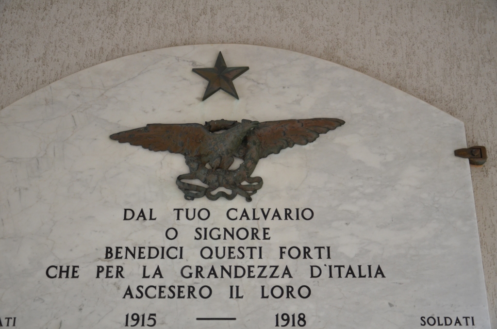 - ISCRIZIONI frase commemorativa in alto al centro e in basso al centro; nomi dei caduti su due elenchi - DAL TUO CALVARIO / O SIGNORE / BENEDICI QUESTI FORTI / CHE PER LA GRANDEZZA D'ITALIA / ASCESERO IL LORO / 1915 - 1918 / SOLDATI / CIAFARDO FELICENICOLA / D'AMELIO DOMENICO / DI PASQUALE LUIGI / FINARELLI GIUSEPPE FU ALFON. / FINARELLI GIUSEPPE DI GIOV. / FINARELLI PASQUALE / GROSSO GIOVANNI / SOLDATI / ROSSI EMILIO / ROSSI GIUSEPPE / ROSSI MICHELE / ROSSI NICOLA / ROSSI PIETRO / SALVATORE NICOLA / 1940 - 1945 / SOLDATI / D'ALOISE VITTORIO / GROSSO ANGELANTONIO / GROSSO FEDERICO FU GIOV. / GROSSO RINALDO FU CAM. / GROSSO SILVINO GUIDO FU GIOV. / SOLDATI / MONACO SILVINO FU NICOLAM. / ROSSI ANTONIO PASQUALE FU NIC. / ROSSI ERMINDO FU CAND. / ROSSI GENNARINO FU FILOTEO / IL PAESE NATIO AI SUOI FIGLI / CONSACRA - numeri romani -