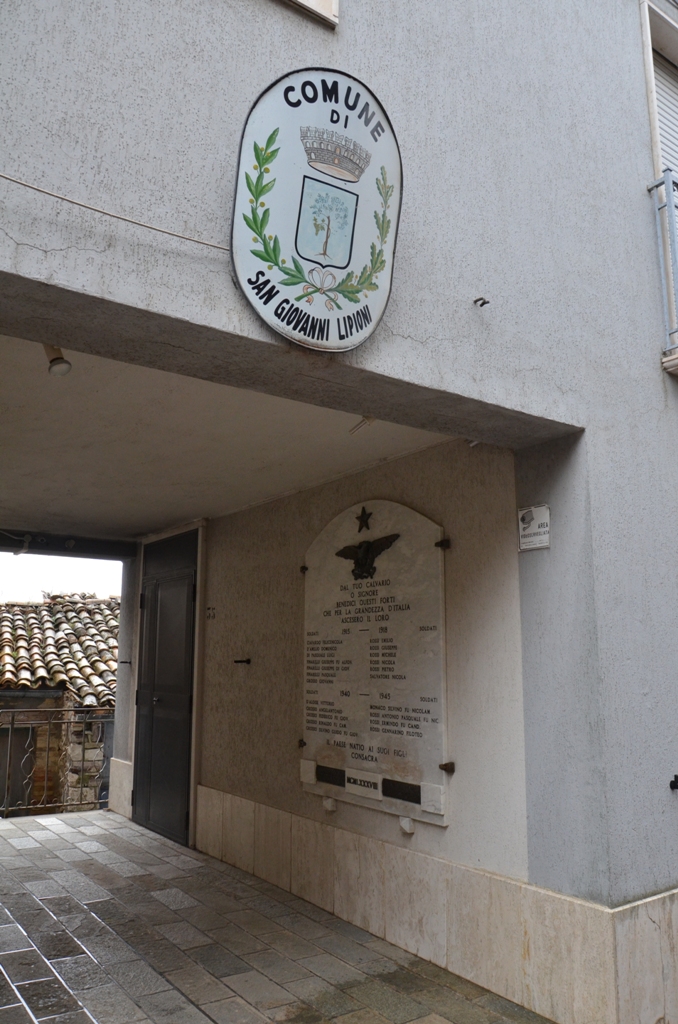 - NOTIZIE STORICO CRITICHE La lapide è stata realizzata sulla base di quella eseguita negli anni '20 e poi andata distrutta. Il libro "San Giovanni Lipioni sulle orme dei padri" (Luciano Picciani, 1995) riporta una seduta di Consiglio del 1923, nella quale si formò un comitato per la raccolta di fondi da destinare alla realizzazione di un monumento ai caduti. Secondo la tradizione locale nell’elenco dei caduti della prima guerra mondiale mancherebbero alcuni nomi