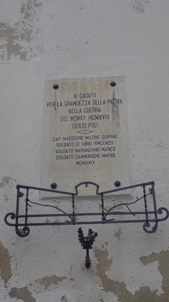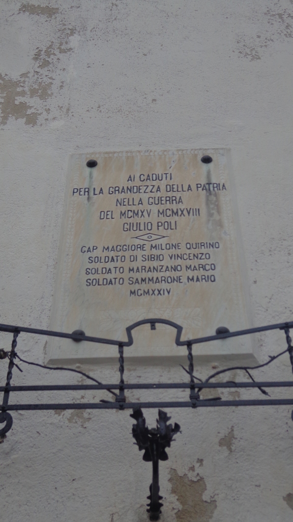 - ISCRIZIONI nella parte centrale - AI CADUTI / PER LA GRANDEZZA DELLA PATRIA / NELLA GUERRA / DEL MCMXV MCMXVIII / GIULIOPOLI / CAP MAGGIORE MILONE QUIRINO / SOLDATO DI SIBIO VINCENZO / SOLDATO MARANZANO MARCO / SOLDATO SAMMARONE MARIO / MCMXXIV - stampatello maiuscolo - a incisione -