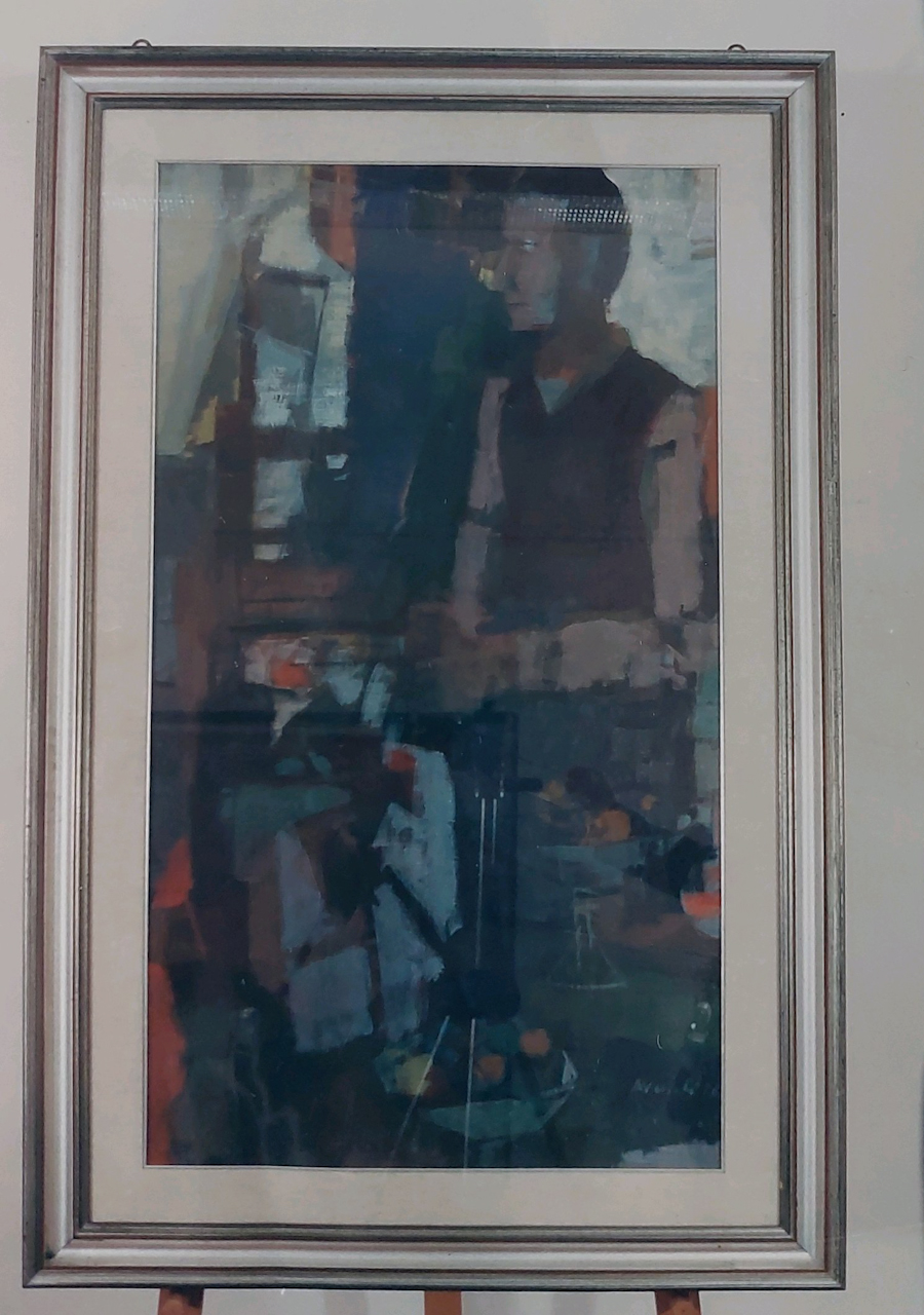 Il dipinto raffigura un uomo all'interno di una stanza. Le pennellate sintetiche restituiscono le forme e gli oggetti secondo un ordine geometrico. L'uomo ha indosso una camicia ed un gilet, è ritratto di profilo mentre guarda davanti a sè. Su un tavolo sono poggiate delle alzate con della frutta. La parete bianca si apre su una finestra