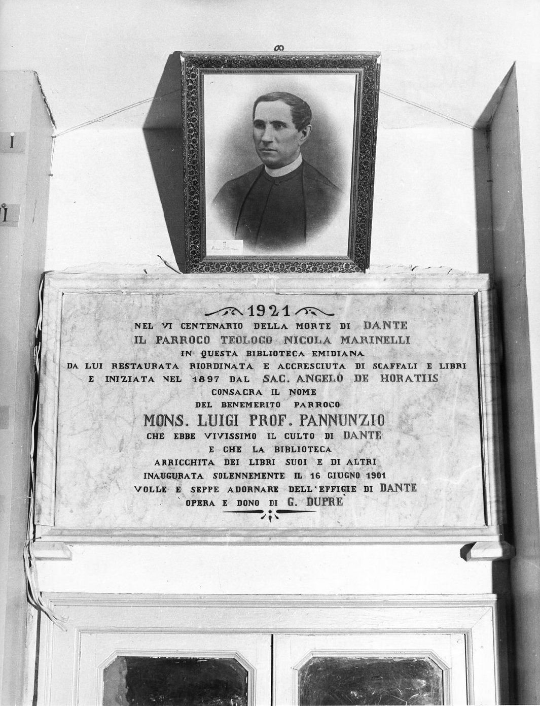 - ISCRIZIONI 1921/ NEL VI CENTENARIO DELLA MORTE DI dANTE/ IL PARROCO TEOLOGO NICOLA MARINELLI/ IN QUESTA BIBLIOTECA EMIDIANA/ DA LUI RESTAURATA RIORDINATA E ACCRESCIUTA DI SCAFFALI E LIBRI/ E INIZIATA NEL 1897 DAL SAC. ANGELO DE HORATIIS/ CONSACRA IL NOME/ DEL BENEMERITO PARROCO/ MONS. LUIGI PROF. PANNUNZIO/ CHE EBBE VIVISSIMO IL CULTO DI DANTE/ E CHE LA BIBLIOTECA/ ARRICHITA DEI LIBRI SUOI E DI ALTRI/ INNAGURATA SOLENNEMENTE IL 16 GIUGNO 1901/ VOLLE E SEPPE ADORNARE DELL'EPIGRAFE DI DANTE/ OPERA E DONO DI G. DUPRè - lettere capitali -