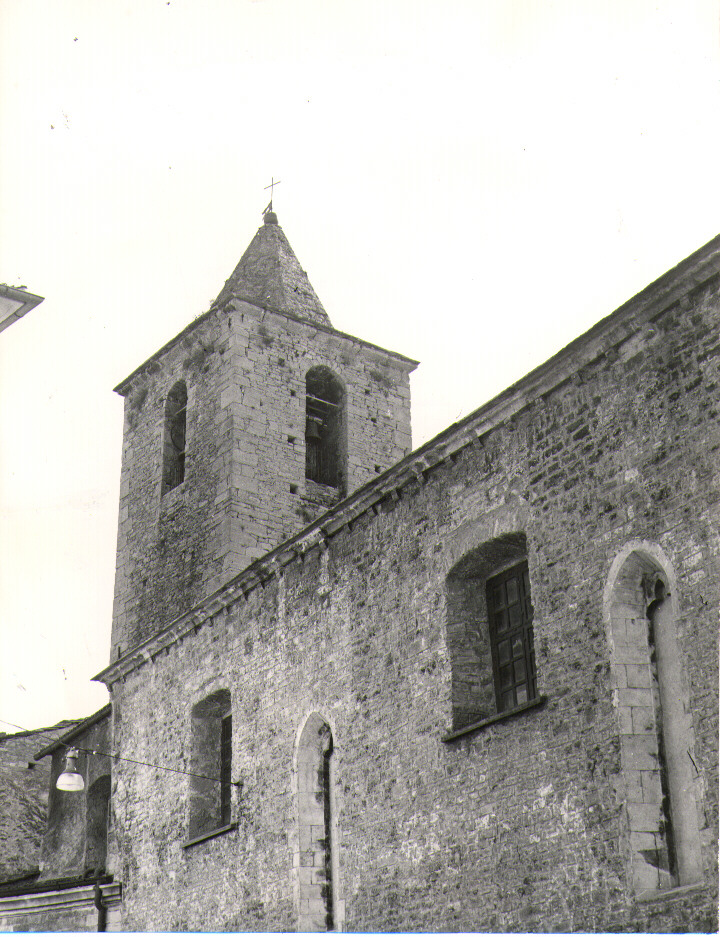 Campanile a pianta quadrata situato al termine della navata sinistra. Apertura a quattro monofore (una per ogni lato). Cuspide a pianta poligonale. Spigoli con modanature a lastre di calcare. Muratura in pietrame calcareo. E' di forme assai semplici e singolarmente tozze