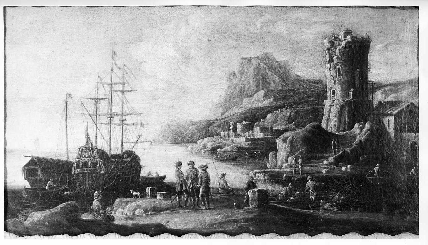 - NOTIZIE STORICO CRITICHE II dipinto può essere riferito ad un artista attivo tra la fine del XVII e l'inizio del XVIII secolo, influenzato dalla pittura di paesaggio elabora ta nell'ambiente partenopeo da autori che proseguono una strada già tracci ata nel corso del Seicento, in cui i soggetti sono frequentemente delle ve dute ideali di marine animate da piccole figure a colloquio o a lavoro nel porto che, con la loro attività, segnano un paesaggio altrimenti immerso nella quiete. In questo dipinto il territorio è segnato dalla presenza di una torre sulla destra, circondata tutta intorno da architetture minori e nel porto si vedono due navi all'ancora e merci appena scaricate o che att endono di essere imbarcate