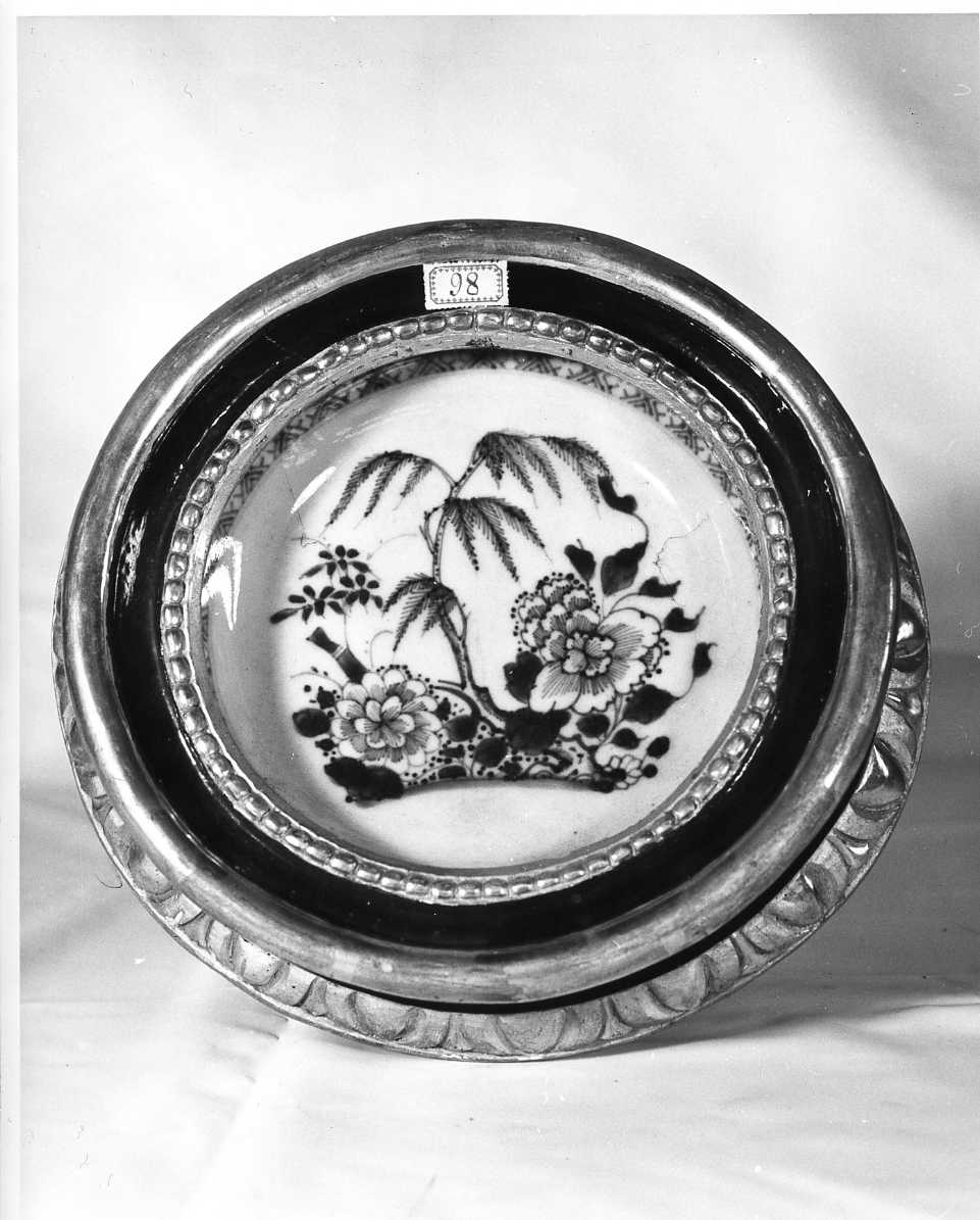 I due piatti sono decorati da motivi di fiori in blu su fondo bianco. Intorno una ricca cornice con ovali in legno nero e oro