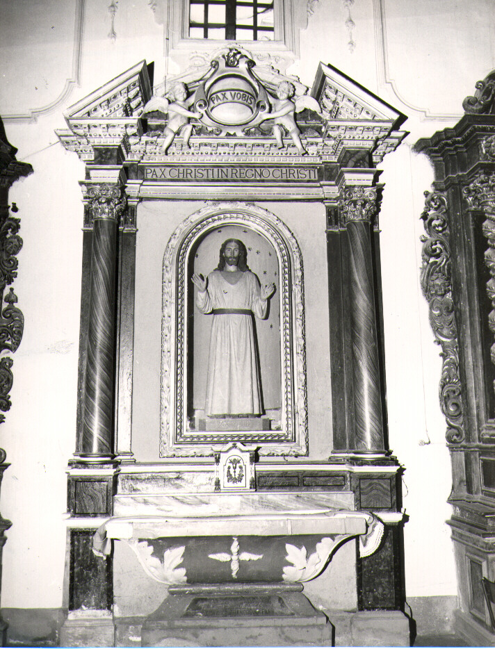 - NOTIZIE STORICO CRITICHE Come risulta dalla targa del paliotto il dossale è stato eretto nel 1916.Il gusto della decorazione è molto trito: visis nota l'intento di riprodurre fedelmente ornati classici che, in opere ottocentesche, venivano liberamente interpretati. Anche l'ampio uso di decorazione a "finto marmo", aderente al vero, testimonia la datazione recente di questo dossale. Notevoleil persistere di modi tradizionali nella fattura dei due angeli