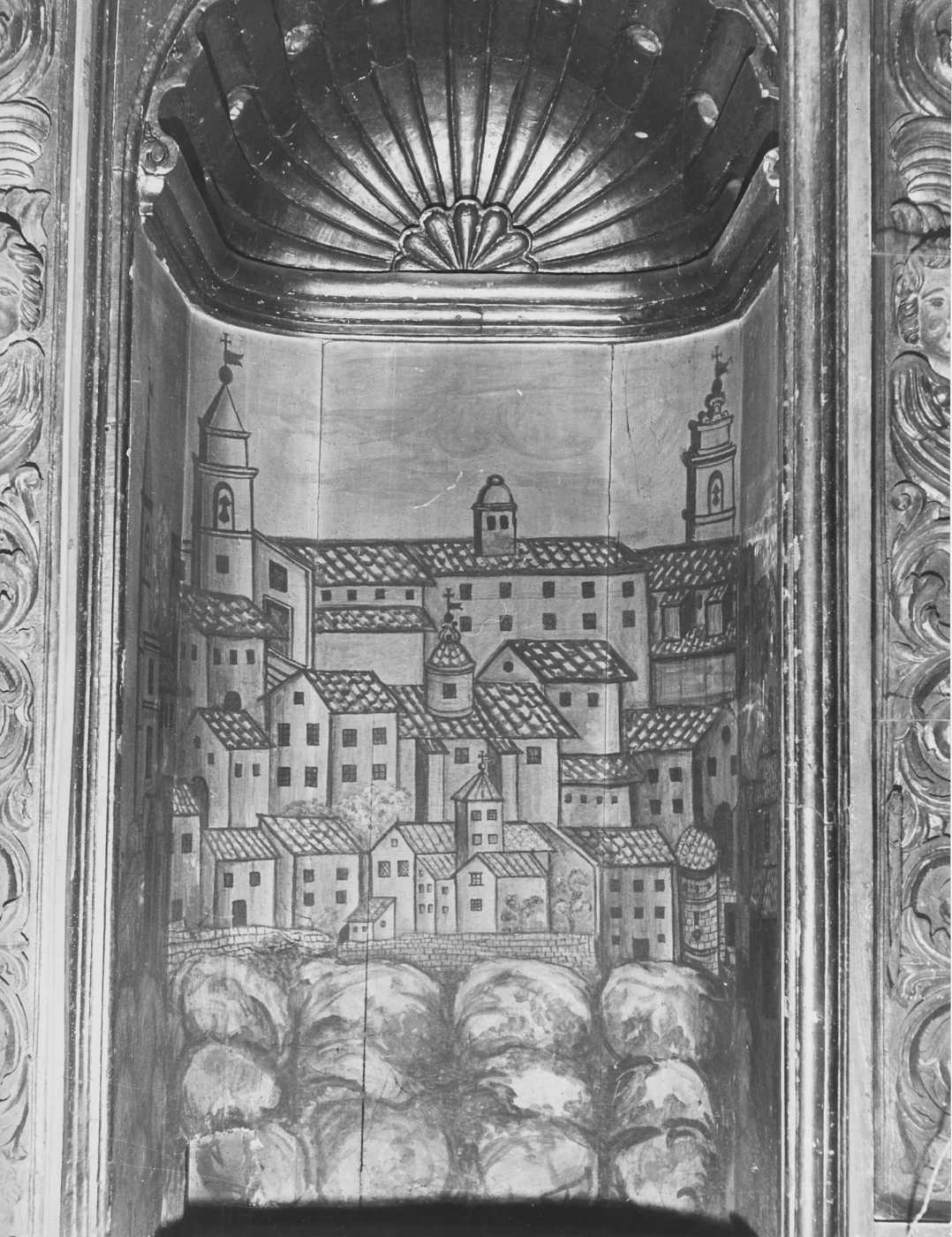 - NOTIZIE STORICO CRITICHE L'esecuzione della pittura è gustosamente popolaresca, nella cura 'naive' di rappresentare un paese (forse Agnone) in un paesaggio campestre. Il dipinto è stato eseguito nella prima metà del secolo XVIII, che è l'epoca in cui fu eretto l'altare. D'altra parte, l'uso di dipingere tali paesaggi nello sfondo delle nicchie, era diffusa a quell'epoca (cfr. nel Lazio l'Altare del Crocifisso a S. Maria in Vescario)